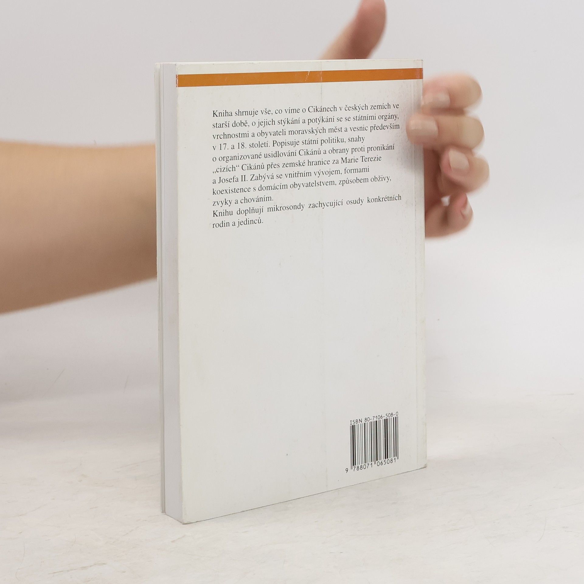 Podtitul: Dějiny etnika na okraji společnosti Ojedinělý pokus o dějiny Cikánů a jejich stýkání a potýkání se státními orgány, vrchnostmi a obyvateli moravských měst a vesnic se soustřeďuje především k 17. a 18. století. Shrnuje vše, co víme o Cikánech v českých zemích ve starší době, těžiště práce však leží v popisu státní politiky, snah o organizované usidlování Cikánů a obrany proti pronikání „cizích“ Cikánů přes zemské hranice za Marie Terezie a Josefa II. K nejzajímavějším patří kapitoly o vnitřním vývoji romského etnika, formách koexistence s domácím obyvatelstvem, jeho způsobech obživy, zvycích a chování. Studii doplňují mikrosondy zachycující osudy konkrétních rodin a jedinců. Vydání první.