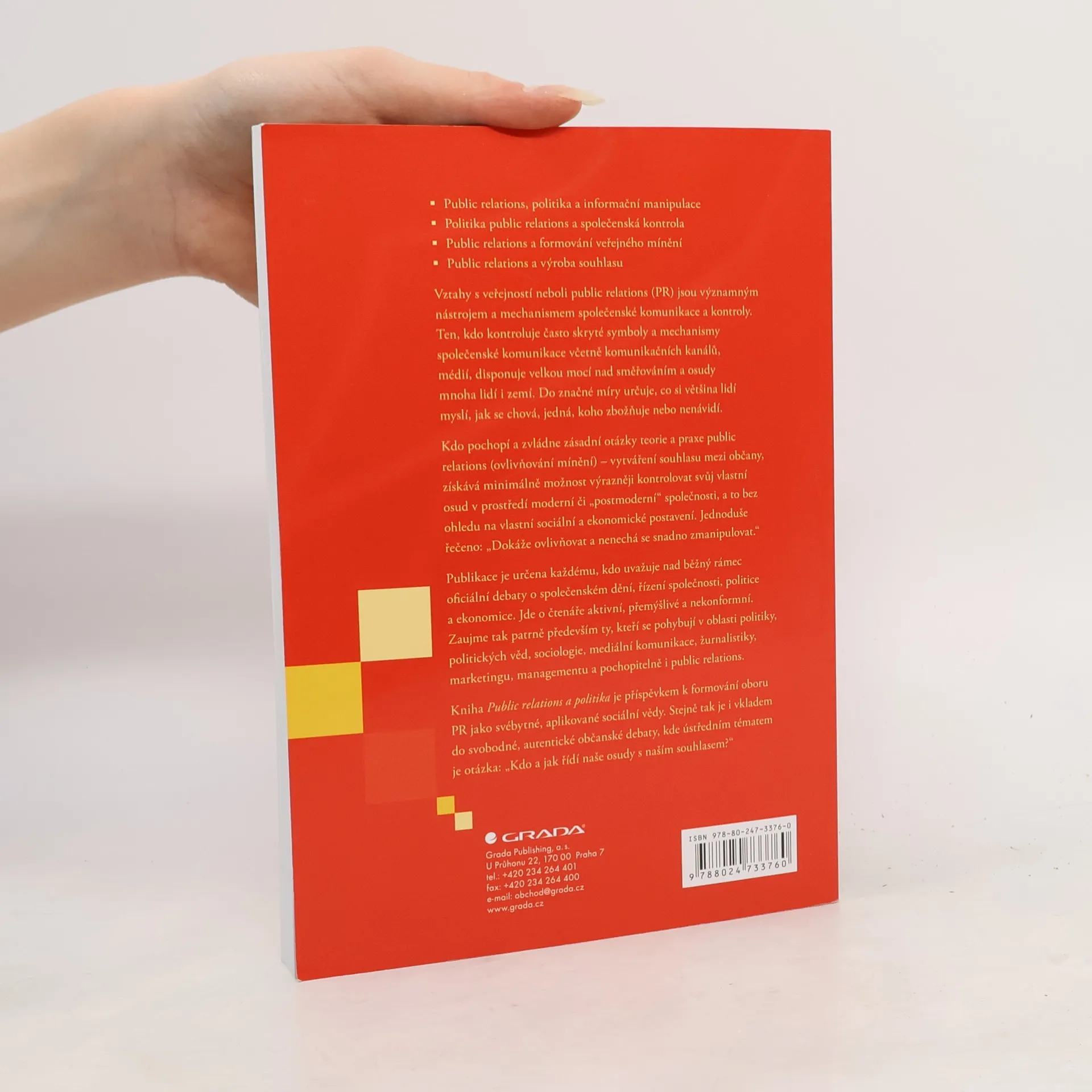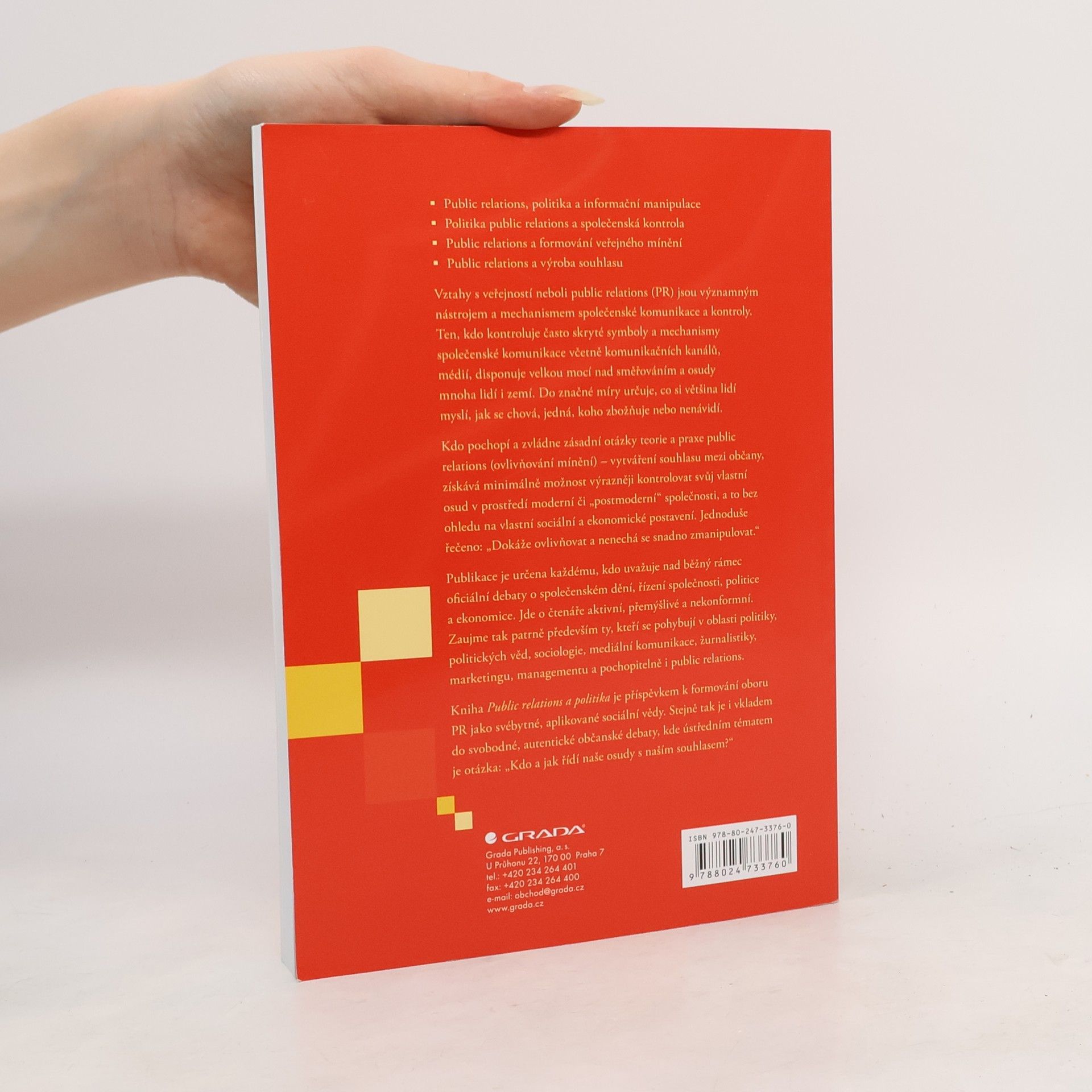 Ojedinělá publikace uznávaného českého autora seznamuje se základními otázkami i technikami mocenské a politické praxe při řízení celospolečenských záležitostí v prostředí moderní, masové společnosti. Mocenské elity reprezentované zejména představiteli politické a hospodářské moci potřebují pro svou vládu souhlas, pochopení a spolupráci veřejnosti, která politiky zmocňuje k řízení veřejných záležitostí. Veřejnost na ně svou volbou do značné míry přenáší i vlastní osudy, jež jsou s politickým řízením celospolečenských procesů úzce spojeny. Vztah mezi mocenskou elitou a veřejností je v rozvinutých, liberálně demokratických státech velmi sofistikovaně pěstován prostřednictvím nástrojů a technik vztahů s veřejností - public relations. Kdo pochopí a zvládne zásadní otázky teorie a praxe PR (ovlivňování mínění) - vytváření souhlasu mezi občany, získává možnost výrazněji kontrolovat svůj vlastní osud v prostředí moderní či "postmoderní" společnosti, dokáže ovlivňovat a nen echá se snadno zmanipulovat.