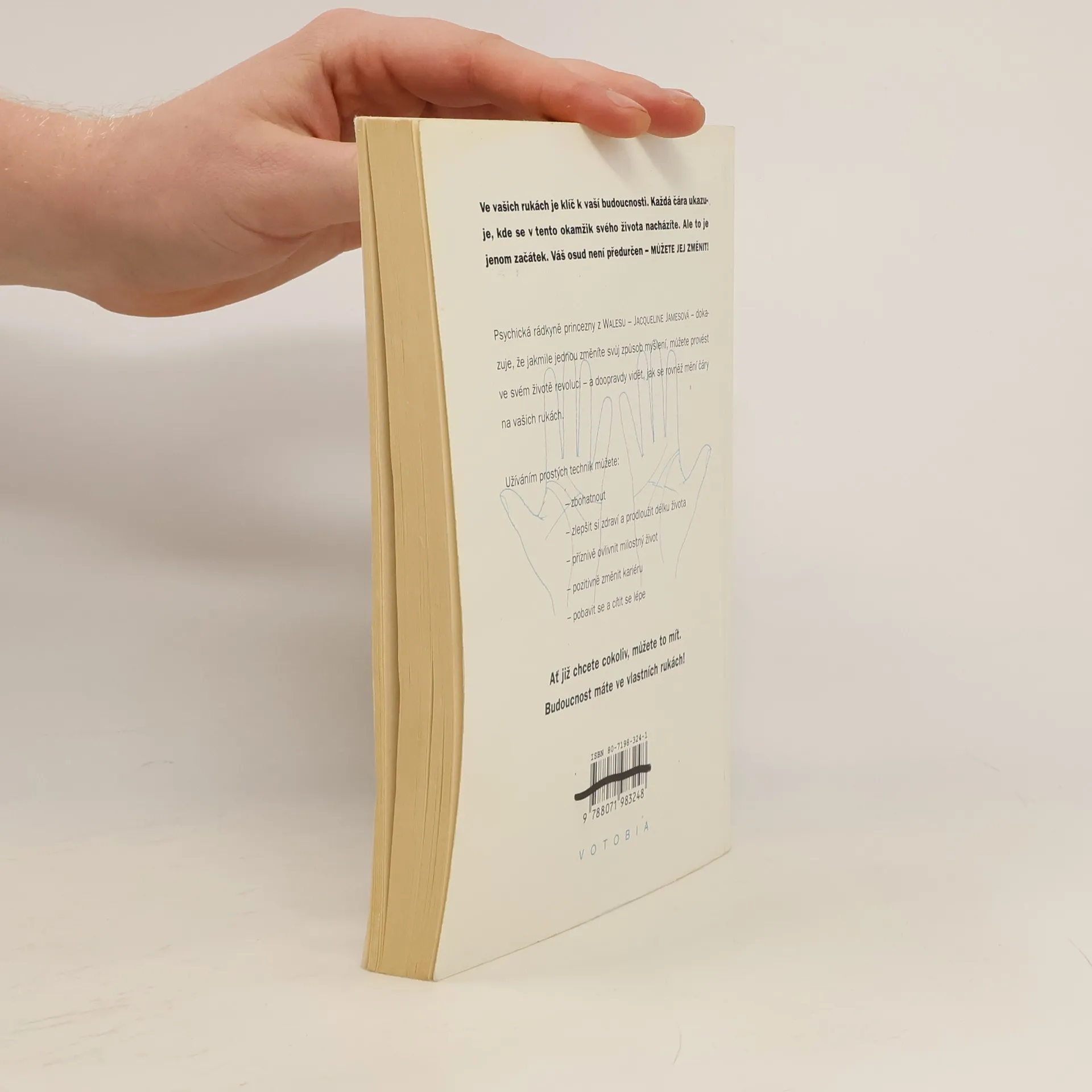 Převezměte kontrolu nad svým životem Ve vašich rukách je klíč k vaší budoucnosti. Každá čára ukazuje, kde se v tento okamžik svého života nacházíte. Váš osud není předurčen - můžete jej změnit! Jakmile jednou změníte způsob myšlení, můžete provést ve svém životě revoluci. Ať již chcete cokoliv, můžete to mít! Můžete zbohatnout, zlpešit si zdraví, prodloužit život, pozitivně změnit kariéru i milostný život.