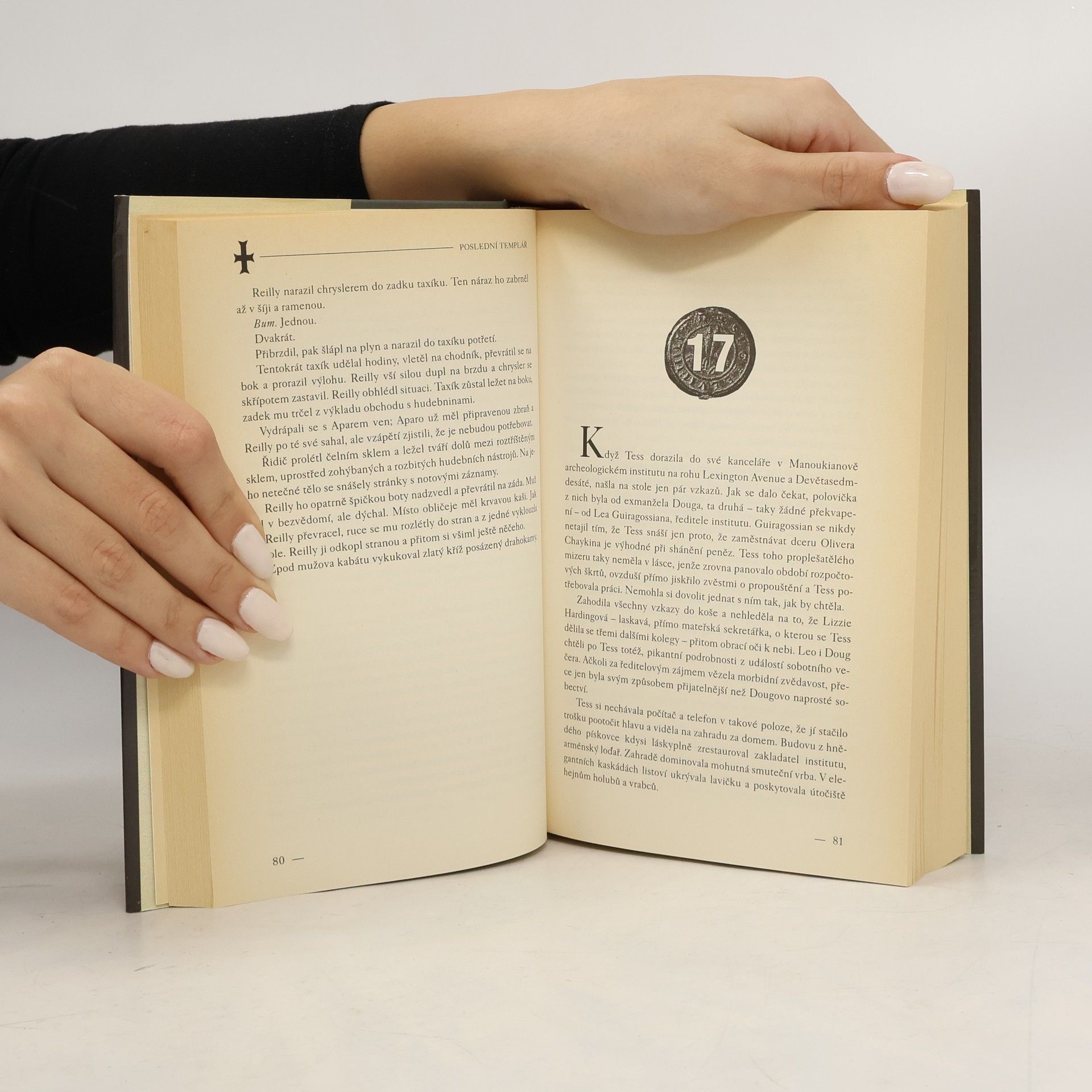 Detektivní thriller o hledání tajuplného templářského artefaktu, ukradeného při loupežném přepadení newyorského muzea. V Metropolitním muzeu v New Yorku se připravuje ojedinělá výstava - vystavovány mají být poklady ukryté po staletí za zdmi Vatikánu. Ale již při vernisáži vnikne i přes všechna bezpečnostní opatření do muzea čtveřice ozbrojených mužů, pozabíjí a zraní mnoho návštěvníků a několik cenných artefaktů ukradne. Do pátrání po zločincích se pustí nejen FBI, ale i archeoložka - očitá svědkyně krádeže, a církev, stojící za každou cenu o navrácení jednoho z odcizených předmětů. Ten by totiž mohl odhalit dlouho ukrývané tajemství zpochybňující samotné základy křesťanství. Vcelku čtivě napsaná kniha s detektivní zápletkou a konspirační teorií čerpající inspiraci z historie tajuplného templářského řádu. Chybět samozřejmě nesmí přitažlivost mezi vyšetřovatelem FBI a důvtipnou archeoložkou.