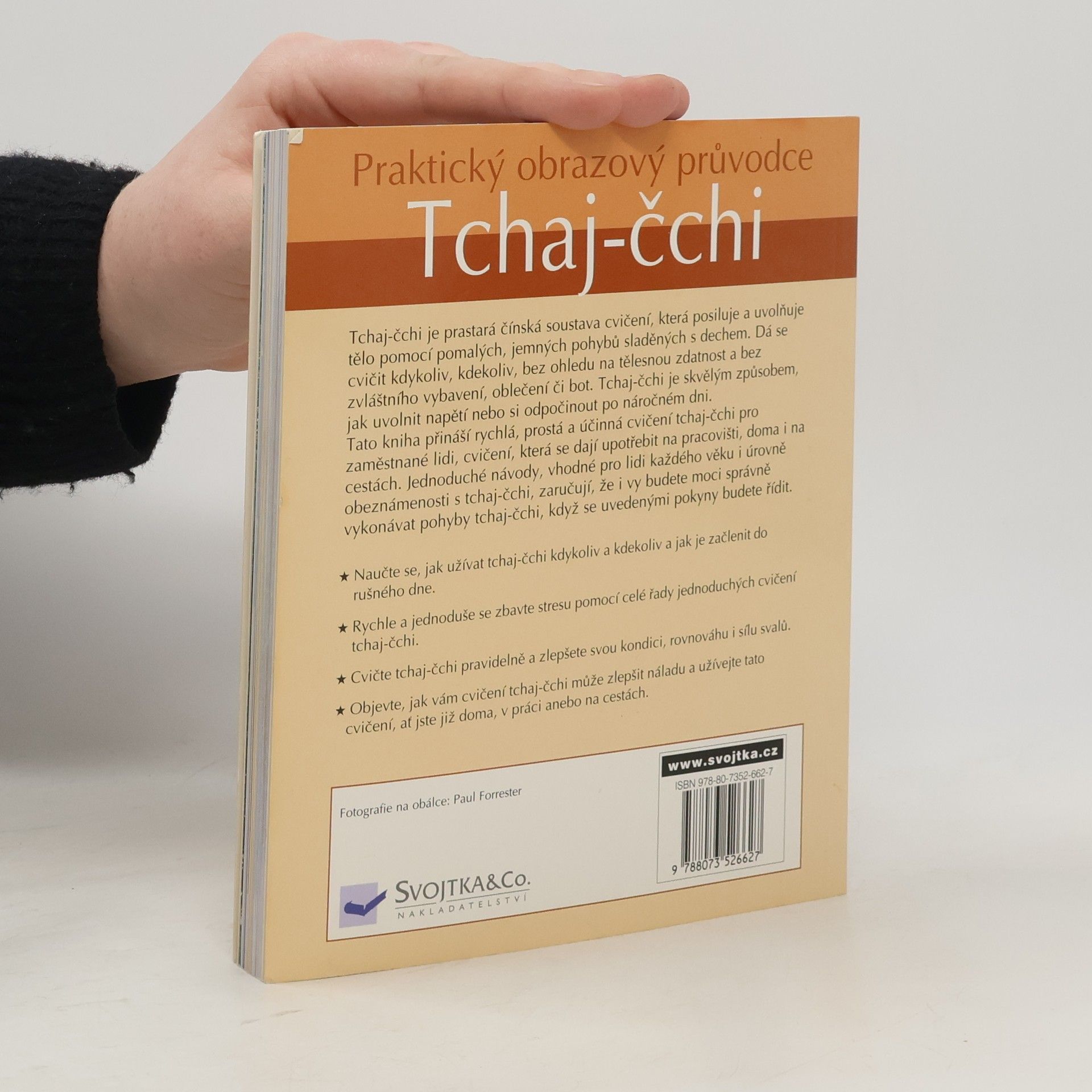 Tato kniha přináší rychlá, prostá a účinná cvičení tchaj-čchi pro zaměstnané lidi, cvičení, která se dají upotřebit na pracovišti, doma i na cestách. Obsahuje jednoduché návody vhodné pro všechny věkové kategorie i úrovně obeznámenosti s tchaj-čchi. I vy budete moci správně vykonávat pohyby tchaj-čchi, když se uvedenými pokyny budete řídit.