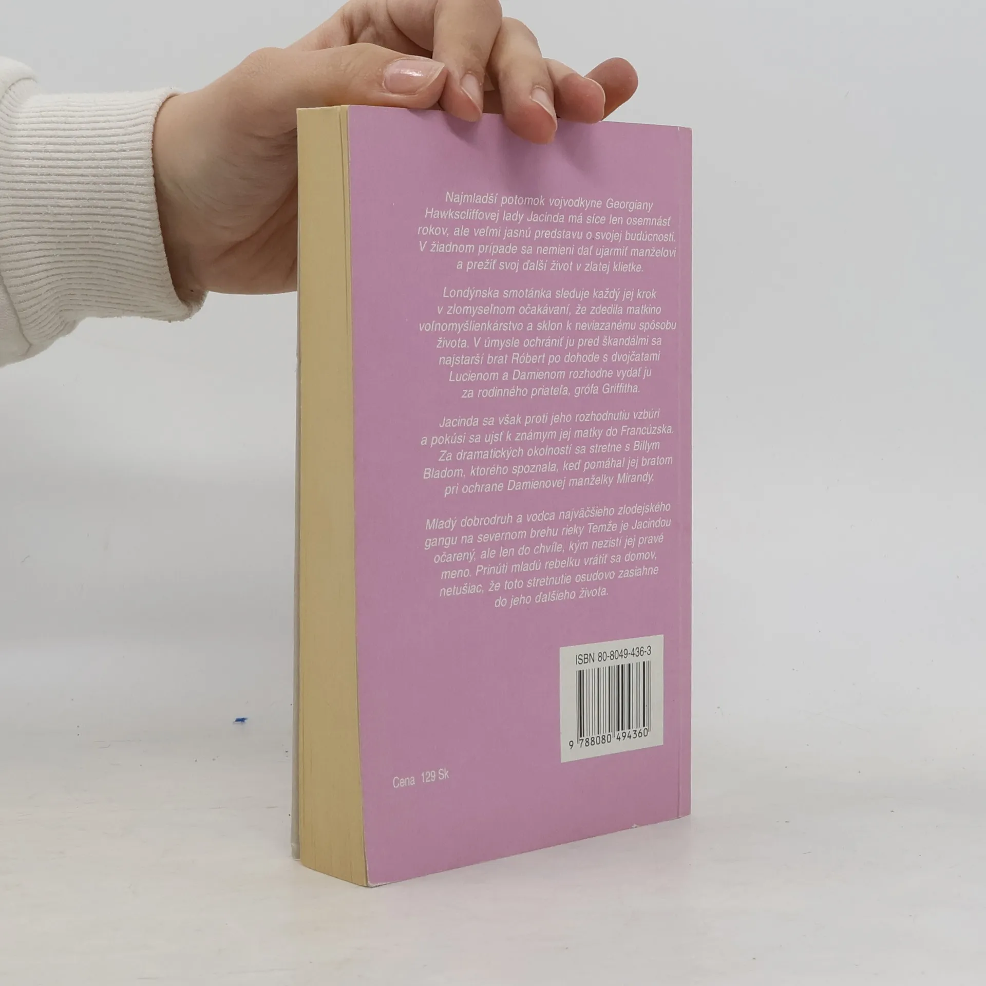 Najmladší potomok vojvodkyne Georgiany Hawkscliffovej lady Jacinda má síce len osemnásť rokov, ale veľmi jasnú predstavu o svojej budúcnosti. V žiadnom prípade sa nemieni dať ujarmiť manželovi a prežiť svoj ďalší život v zlatej klietke. Londýnska smotánka sleduje každý jej krok v zlomyseľnom očakávaní, že zdedila matkino voľnomyšlienkárstvo a sklon k neviazanému spôsobu života. V úmysle ochrániť ju pred škandálmi sa najstarší brat Róbert po dohode s dvojčatami Lucienom a Damienom rozhodne vydať ju za rodinného priateľa, markíza Griffitha. Jacinda sa však proti jeho rozhodnutiu vzbúri a pokúsi sa ujsť k známym jej matky do Francúzska. Za dramatických okolností sa stretne s Billym Bladom, ktorého spoznala, keď pomáhal jej bratom pri ochrane Damienovej manželky Mirandy.