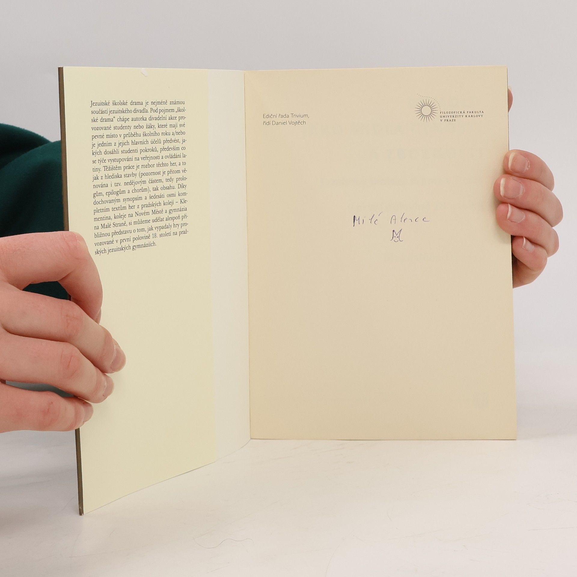 Kniha pražské teatroložky, která se podílí mj. na několikasvazkovém projektu České divadelní encyklopedie, detailně přibližuje nejméně známou součást jezuitského divadla. Pod pojmem „školské drama“ chápe autorka divadelní akce provozované studenty nebo žáky, které mají své pevné místo v průběhu školního roku a/nebo je jedním z jejich hlavních účelů předvést, jakých dosáhli studenti pokroků, především co se týče vystupování na veřejnosti a ovládání latiny. Těžištěm knihy je rozbor těchto her, a to jak z hlediska stavby (pozornost je přitom věnována i tzv. nedějovým částem, tedy prologům, epilogům a chorům), tak obsahu. Díky dochovaným synopsím a 68 kompletním textům her z pražských kolejí – Klementina, koleje na Novém Městě a gymnázia na Malé Straně, si můžeme udělat alespoň přibližnou představu o tom, jak vypadaly hry provozované v první polovině 18. století na pražských jezuitských gymnáziích.