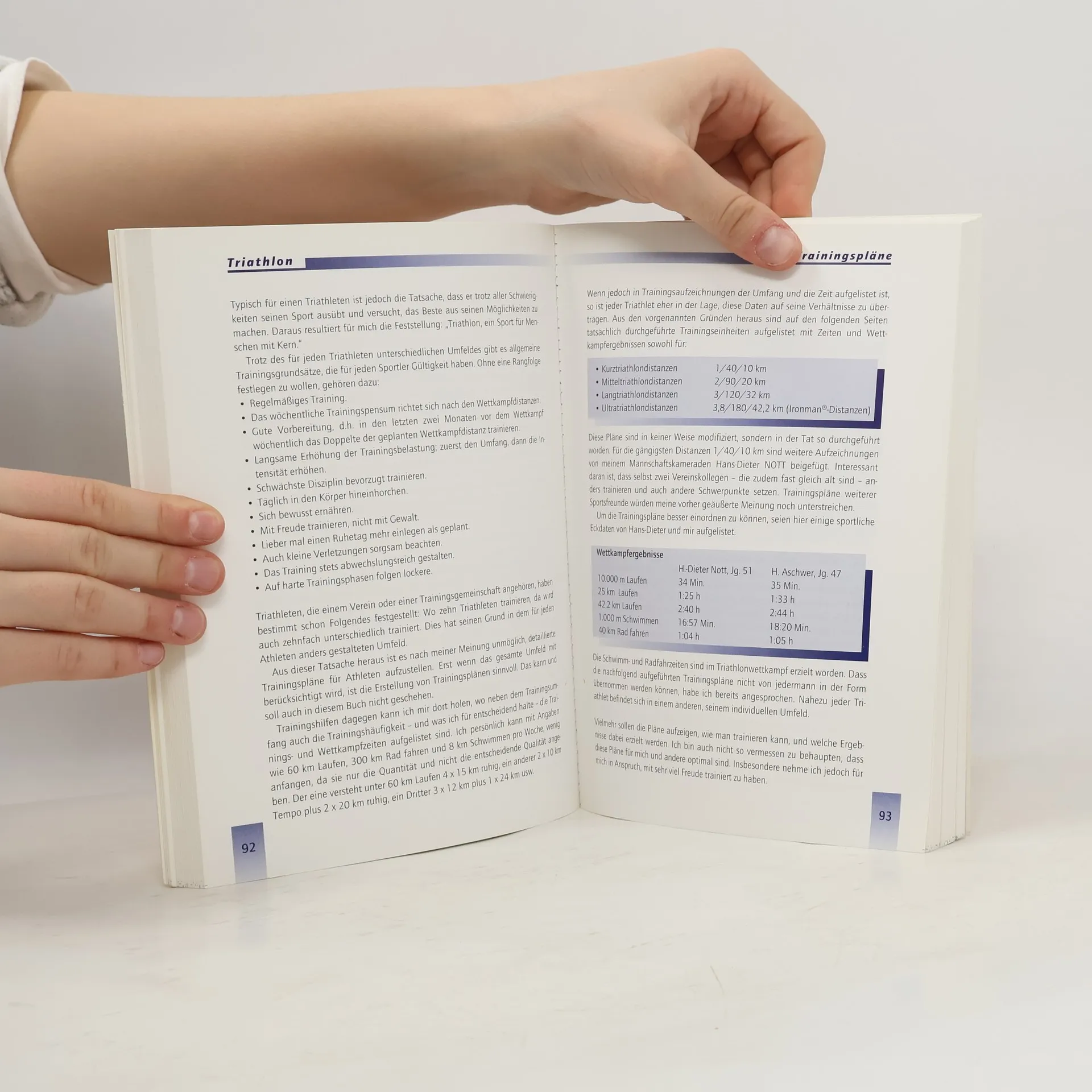 Das völlig überarbeitete Handbuch ist nach wie vor ein praxisorientiertes Werk und wendet sich an Anfänger und Fortgeschrittene des Triathlonsports, die keinen eigenen Trainer haben. Sportlerinnen und Sportler jeden Alters, ob Anfänger oder Fortgeschrittene, ob Freizeit- oder Leistungssportler, alle erhalten praktische Tipps, Anregungen und Trainingshinweise. Das Buch enthält Trainingspläne für Kurz-, Mittel- oder Langdistanzen für die direkte Vorbereitung auf Wettbewerbe. Die Trainingspläne basieren auf Niederschriften von tatsächlich durchgeführten Trainingseinheiten, sie sind detailliert dargestellt und lassen für den Triathleten Rückschlüsse auf seine eigene Leistungsfähigkeit zu. In den Ernährungstipps werden Erfahrungen und Rezepte eingearbeitet. Mehrere hundert Triathlonveranstaltungen (Kurz-, Mittel-, Langstrecke) in Deutschland, Österreich und der Schweiz sind mit Anschriften aufgeführt. Der Triathlongipfel Hawaii wird näher dargestellt. Wertvolle Hinweise zum Thema Triathlon und der Bericht vom Abenteuer „Doppel-Ironman®“ runden mit den Anschriften der Veranstalter von Ultra-Mehrfachdistanzen das Thema ab. „Vor allem seine persönlichen, originalen Trainingspläne waren für mich hochinteressant zu lesen, weil man andere Trainingsumfänge und Trainingsaufteilungen erkennt, sich versucht mit diesen zu vergleichen und sich daran zu motivieren.“ Amazon. de