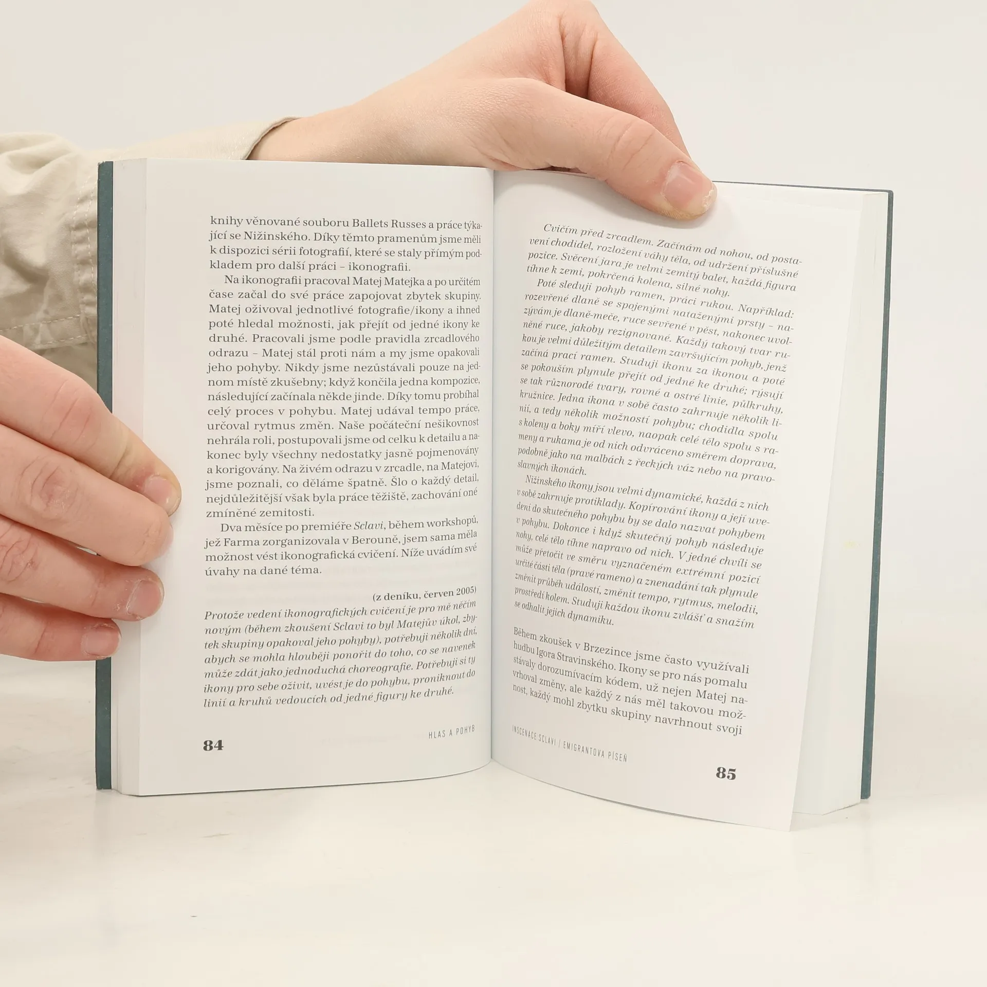 Formou deníkových záznamů, vzpomínek a zápisů hereckých cvičení konfrontuje autorka zkušenosti z legendární školy antropologického divadla v polských Gardzienicích se zážitky ze zkoušení inscenace Sclavi / Emigrantova Píseň, kterou se divadelní studio Farma v jeskyni, sídlící v Čechách, proslavilo u nás i ve světě. Předloženo jako disertační práce v oboru Scénická tvorba a teorie scénické tvorby (Scénologie) a úspěšně obhájeno 5.11.2009.