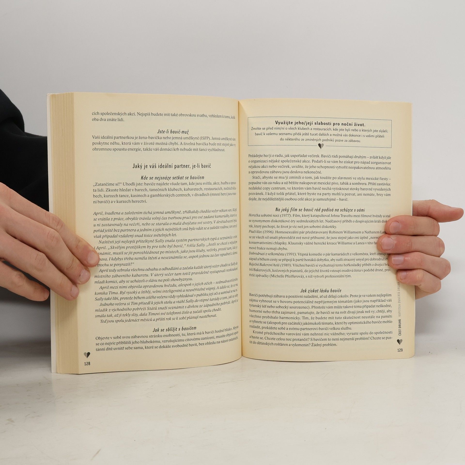 Podtitul: "Metoda založená na nejpopulárnějším osobnostním testu současnosti" Pestrá a praktická kniha plná návodů a jednoduchých partnerských testů. Dostáváte do ruky vědecky podloženou a účinnou metodu, díky níž je možné okamžitě zjistit, zda se k vám člověk, s nímž jste se právě seznámili, jako partner hodí či nikoli. Kde se mohu se svým ideálním partnerem/partnerkou setkat? Jak mám prolomit ledy a přirozeným způsobem navázat kontakt s osobou, která mě přitahuje, když jsem ostýchavý/á?Jak získám srdce svého ideálního partnera?