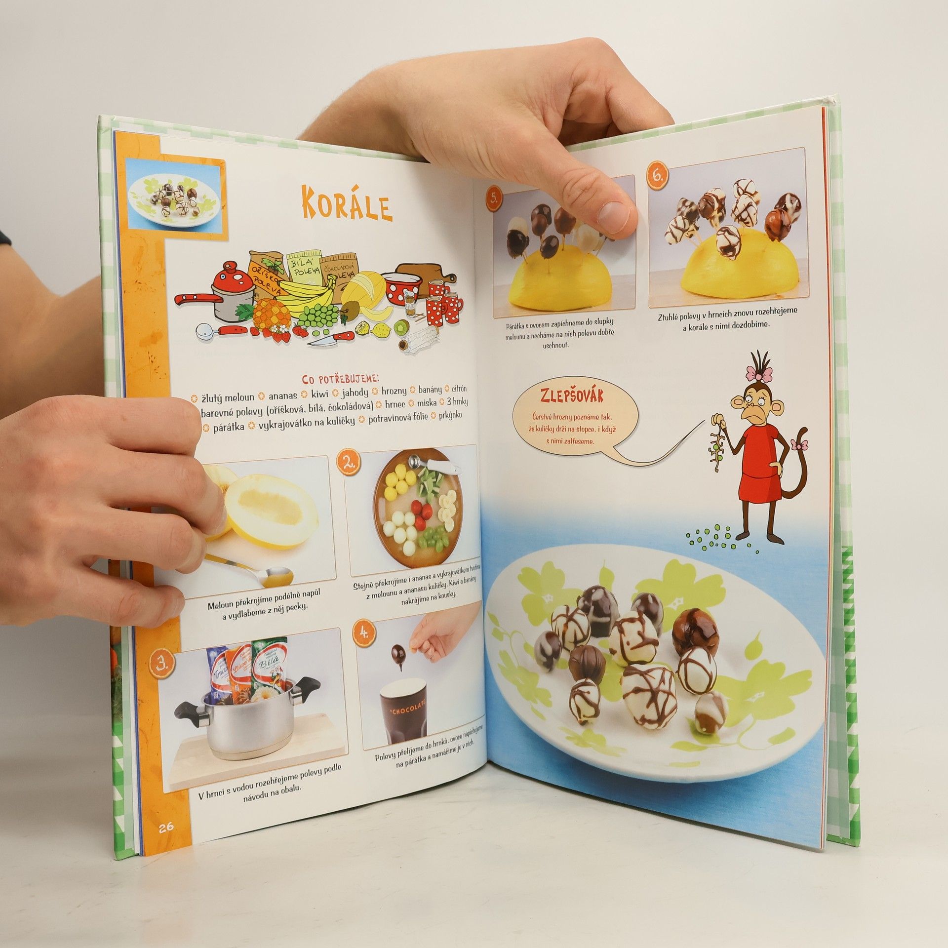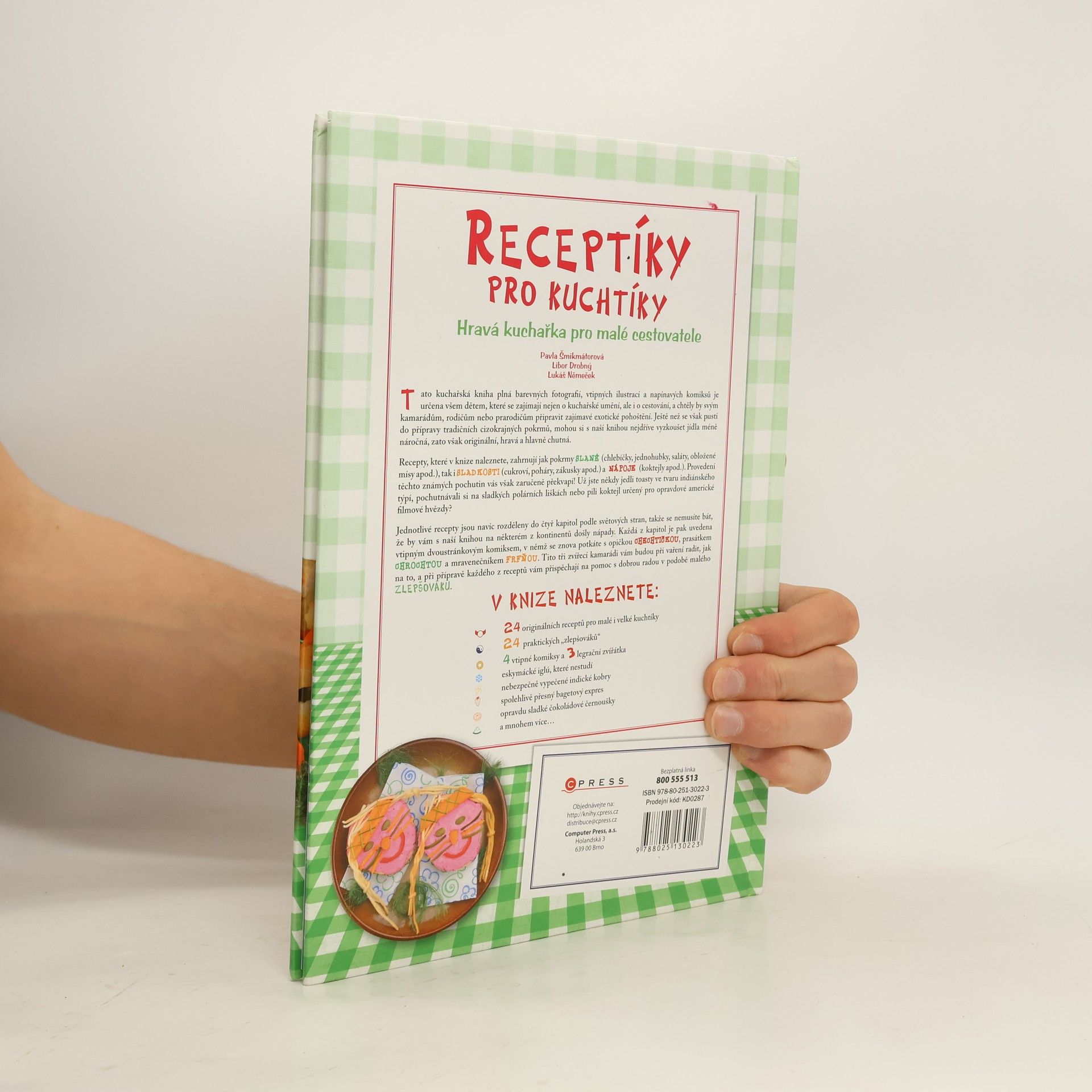 Tato kuchařská kniha plná barevných fotografií, vtipných ilustrací a napínavých komiksů je určena všem dětem, které se zajímají nejen o kuchařské umění, ale i o cestování, a chtěly by svým kamarádům, rodičům nebo prarodičům připravit zajímavé exotické pohoštění. Ještě než se však pustí do přípravy tradičních cizokrajných pokrmů, mohou si s naší knihou nejdříve vyzkoušet jídla méně náročná, zato však originální, hravá a hlavně chutná. Recepty, které v knize naleznete, zahrnují jak pokrmy SLANÉ (chlebíčky, jednohubky, saláty, obložené mísy apod.), tak i SLADKOSTI (cukroví, poháry, zákusky apod.) a NÁPOJE (koktejly apod.). Provedení těchto známých pochutin vás však zaručeně překvapí! Už jste někdy jedli toasty ve tvaru indiánského týpí, pochutnávali si na sladkých polárních liškách nebo pili koktejl určený pro opravdové americké filmové hvězdy? Jednotlivé recepty jsou navíc rozděleny do čtyř kapitol podle světových stran, takže se nemusíte bát, že by vám s naší knihou na některém z kontinentů došly nápady. Každá z kapitol je pak uvedena vtipným dvoustránkovým komiksem, v němž se znova potkáte s opičkou CHECHTIČKOU, prasátkem CHROCHTOU a mravenečníkem FRFŇOU. Tito tři zvířecí kamarádi vám budou při vaření radit, jak na to, a při přípravě každého z receptů vám přispěchají na pomoc s dobrou radou v podobě malého ZLEPŠOVÁKU.