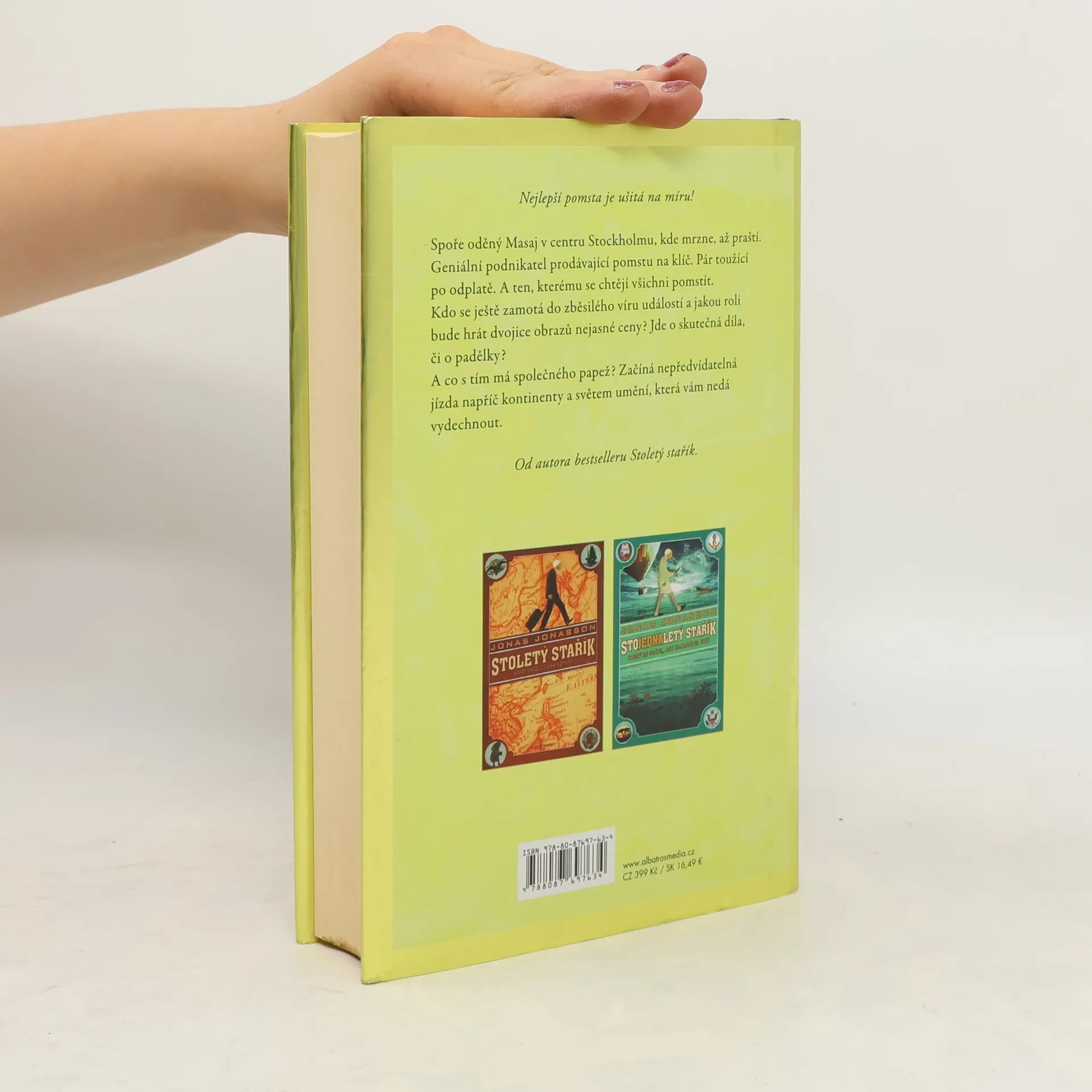 Nejlepší pomsta je ušitá na míru! Od autora bestselleru Stoletý stařík. Spoře oděný Masaj v centru Stockholmu, kde mrzne, až praští. Geniální podnikatel prodávající pomstu na klíč. Pár toužící po odplatě. A ten, kterému se chtějí všichni pomstít. Kdo se ještě zamotá do zběsilého víru událostí a jakou roli bude hrát dvojice obrazů nejasné ceny? Jde o skutečná díla, či o padělky? A co s tím má společného papež? Začíná nepředvídatelná jízda napříč kontinenty a světem umění, která vám nedá vydechnout.