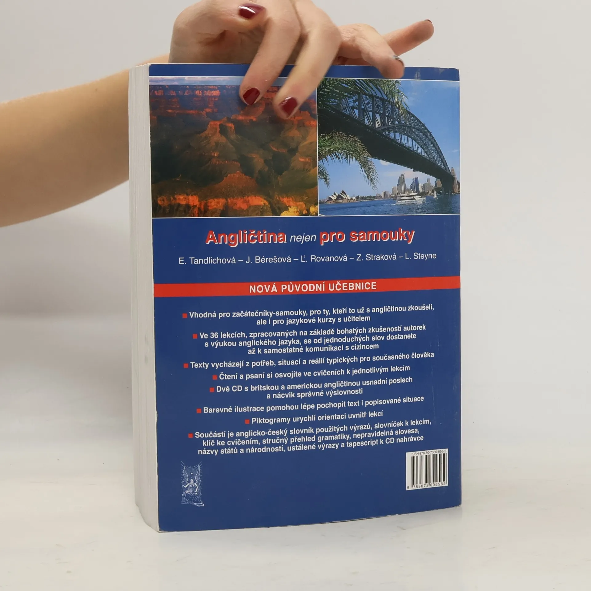 Vhodná pro začátečníky - samouky, pro ty, kteří to už s angličtinou zkoušeli, ale i pro ty jazykové kurzy s učitelem. Ve 36 lekcích, zpracovaných na základě bohatých zkušeností autorek s výukou anglického jazyka, se od jednoduchých slov dostanete až k samostatné komunikaci s cizincem. Texty vycházejí z potřeb, situací a reálií typických pro současného člověka. Čtení a psaní si osvojíte ve cvičeních k jednotlivým lekcím. Dvě CD s britskou a americkou angličtinou usnadní poslech a nácvik správné výslovnosti. Barevné ilustrace pomohou lépe pochopit text i popisované situace. Piktogramy urychlí orientaci uvnitř lekcí. Součástí je anglicko - český slovník použitých výrazů, slovníček k lekcím, klíč ke cvičením, stručný přehled gramatiky, nepravidelná slovesa, názvy států a národností, ustálené výrazy a tapescipt k CD nahrávce.
