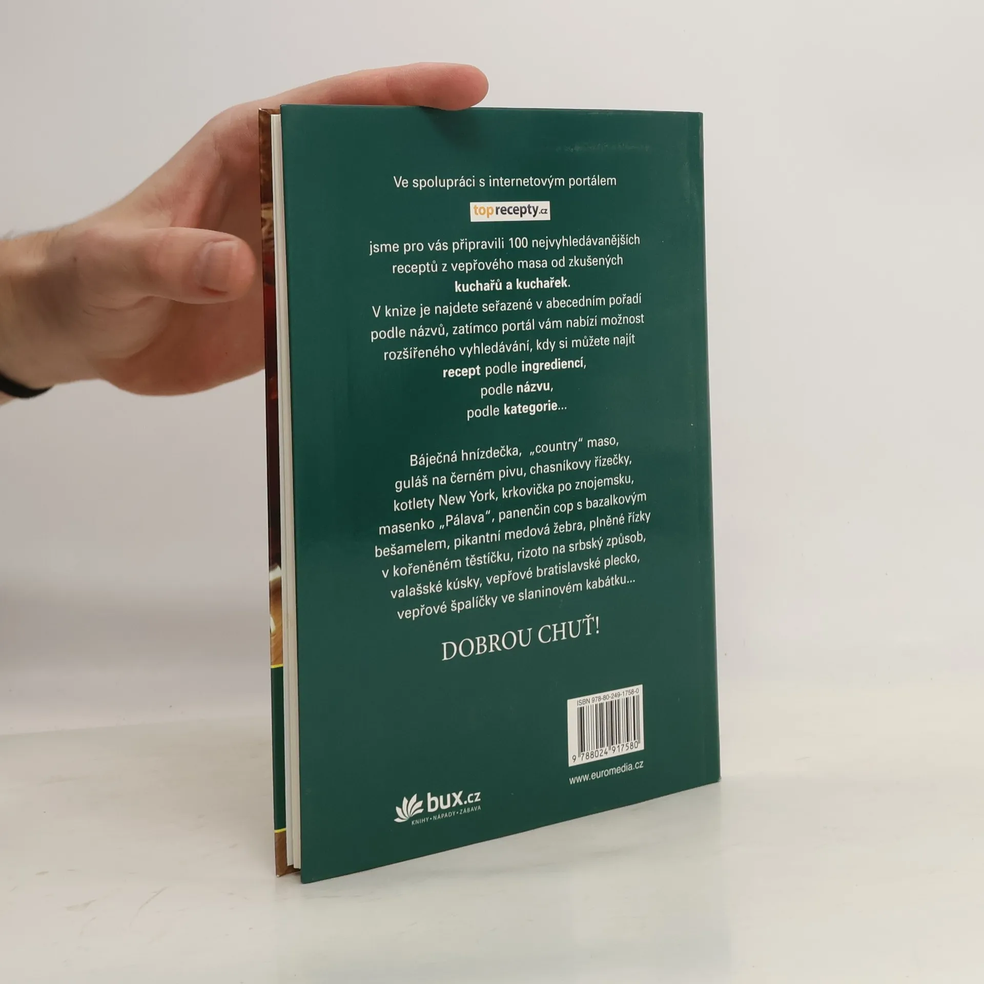 100 nejvyhledávanějších receptů z vepřového masa od zkušených kuchařů doplněné fotografiemi. V knize je najdete seřazené v abecedním pořadí podle názvů, zatímco portál toprecepty.cz vám nabízí možnost rozšířeného vyhledávání: Báječná hnízdečka, „country“ maso, guláš na černém pivu, chasníkovy řízečky, kotlety New York, krkovička po znojemsku, masenko „Pálava“, panenčin cop s bazalkovým bešamelem, pikantní medová žebra, plněné řízky v kořeněném těstíčku...