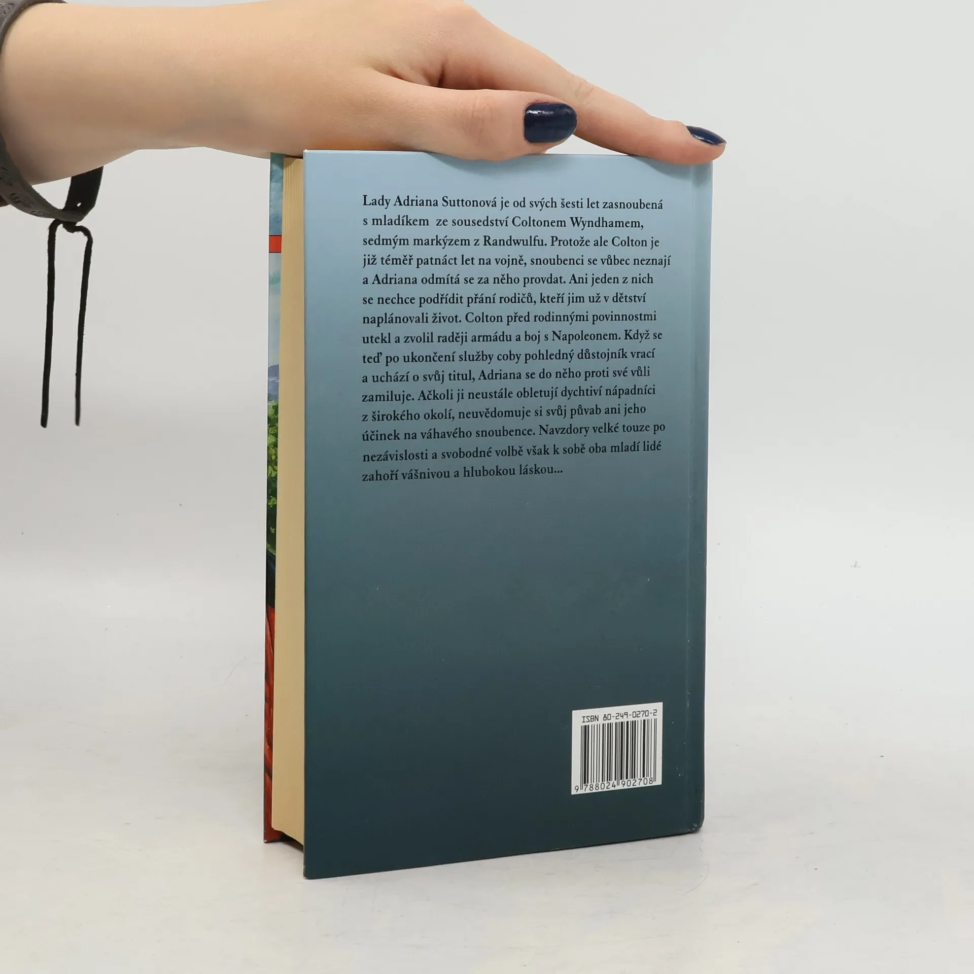 Anglie 1815 Lady Adriana Suttonová je od svých šesti let zasnoubená s mladíkem ze sousedství Coltonem Wyndhamem, sedmým markýzem z Randwulfu. Protože ale Colton je již téměř patnáct let na vojně, snoubenci se vůbec neznají a Adriana odmítá se za něho provdat. Ani jeden z nich se nechce podřídit přáni rodičů, kteří jim už v dětství naplánovali život. Colton před rodinnými povinnosti utekl a zvolil si raději armádu a boj s Napoleonem. Když se teď po ukončení služby coby pohledný důstojník vrací a uchází o svůj titul, Adriana se do něho proti své vůli zamiluje. Ačkoli ji neustále obletují dychtiví nápadníci z širokého okolí, neuvědomuje si svůj půvab ani jeho účinek na váhavého snoubence. Navzdory velké touze po nezávislosti a svobodné volbě však k sobě oba mladí lidé zahoří vášnivou a hlubokou láskou …