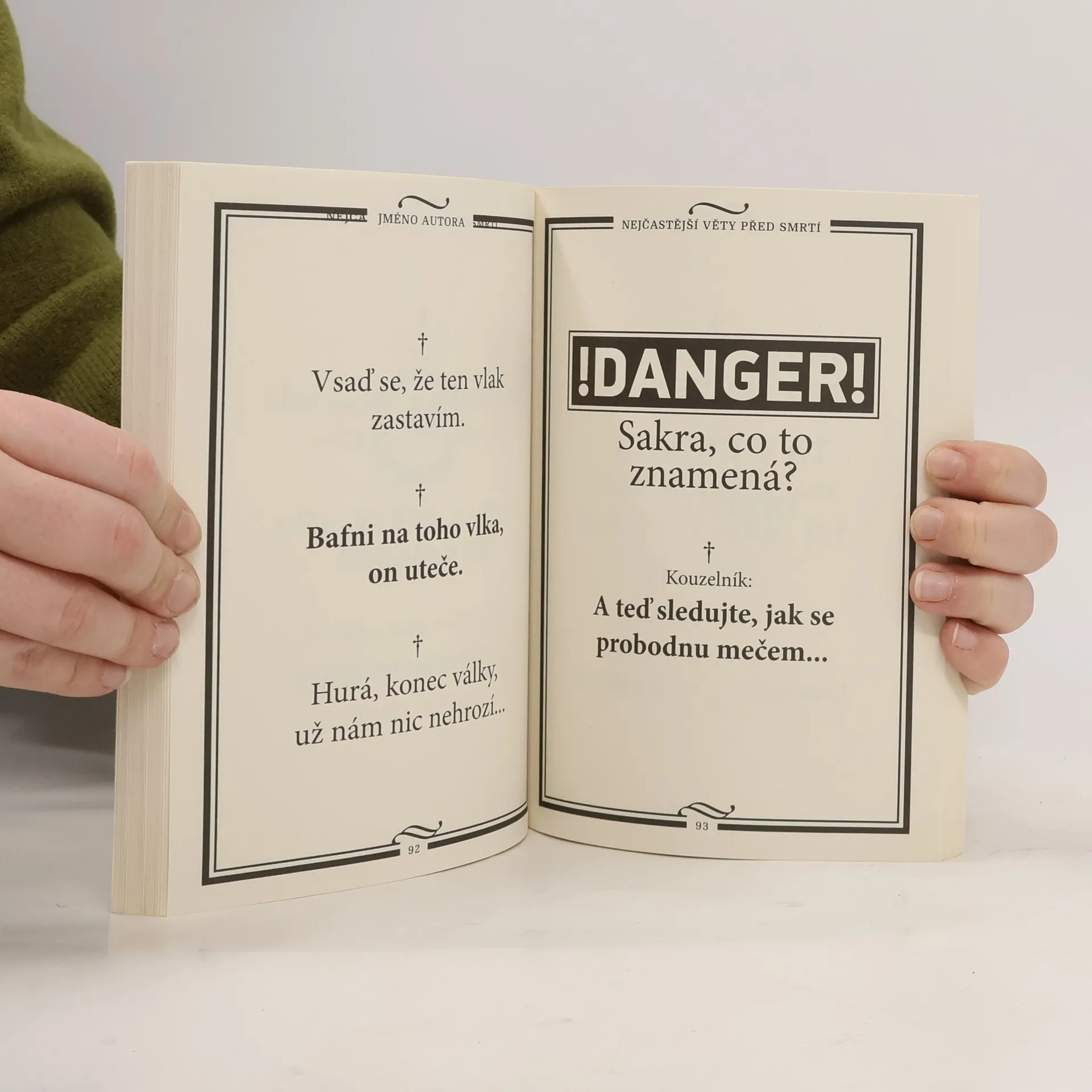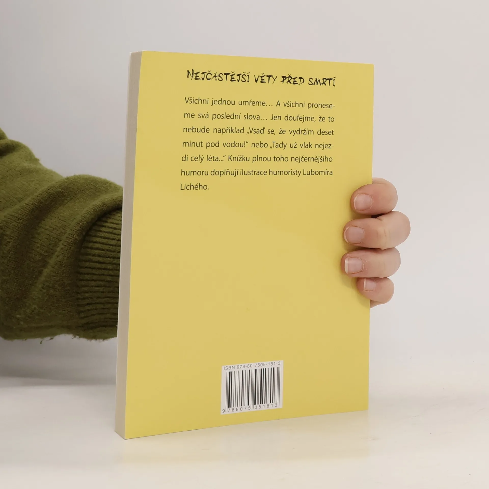 Všichni jednou umřeme… A všichni proneseme svá poslední slova… Jen doufejme, že to nebude například „Vsaď se, že vydržím deset minut pod vodou“ nebo „Tady už vlak nejezdí celý léta“. Knížku plnou toho nejčernějšího humoru doplňují ilustrace humoristy Lubomíra Lichého.