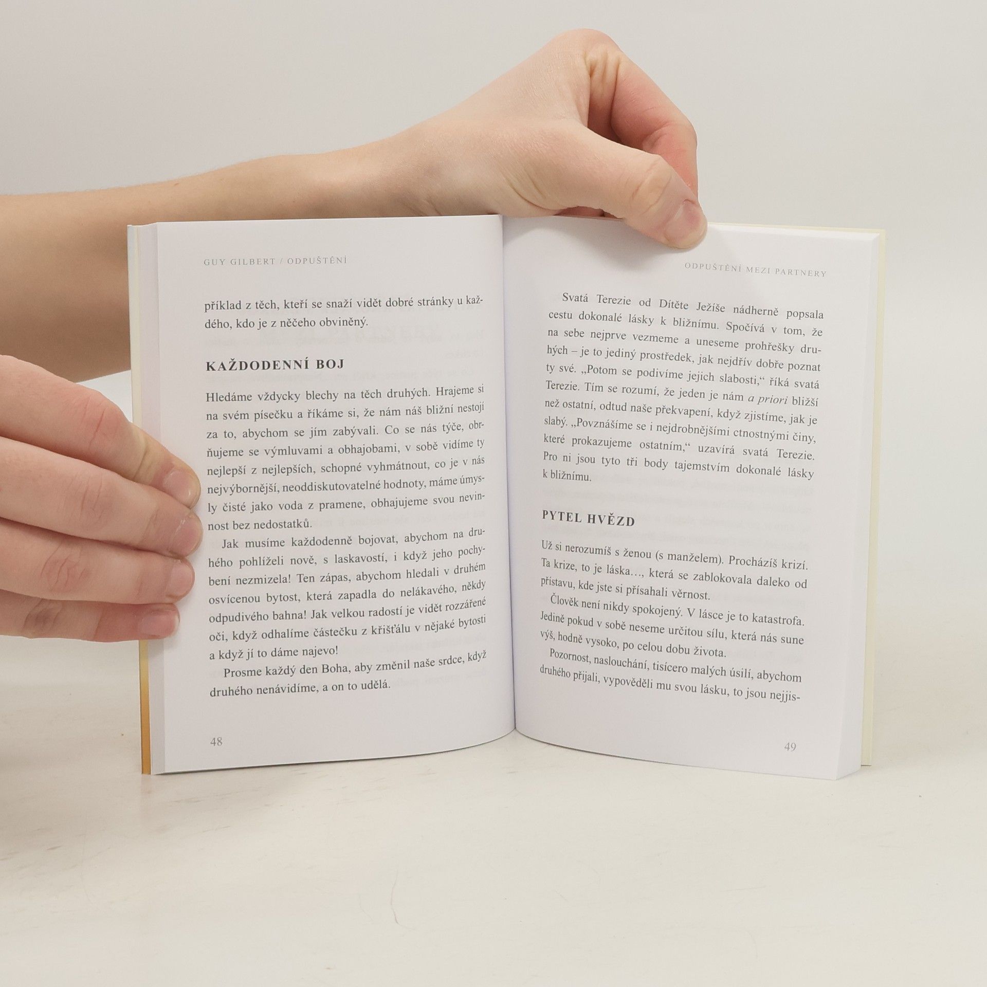 Kniha známého kněze a vychovatele delikventní mládeže přibližuje mimořádné důležité téma odpuštění, které je nejkrásnější cestou ke svobodě. Gilbert skrze svou bohatou zkušenost s lidmi z okraje společnosti, zločinci či vězni nijak nebagatelizuje zlo a příkoří, která se lidem dějí. Přesto potvrzuje, že jen cesta odpuštění vede k vnitřní vyrovnanosti, pokoji a radosti. Právě křesťané jsou pro něj ti, kteří mají ve společnosti neustále realizovat obtížný pokyn odpouštět, a to i tam, kde je to zdánlivě nemožné. Gilbert ukazuje, kde hledat zdroj síly k odpuštění, jak odpouštět v rodině, ve vztazích, jaké nástroje nabízí ve svátostech církev. Jak píše: „Kristus nikdy neřekl svým katům: ‚Odpouštím vám‘, ale: ‚Otče, odpusť jim.‘ Jen tak je totiž možné najít sílu k odpuštění. Nejde totiž o skutek naší vůle, je to akt lásky, který nám může vdechnout jen sám Bůh.“ Guy Gilbert je francouzský kněz, v Portále vyšla celá řada jeho úspěšných knih, naposledy např. Rodina, Čas žít nebo Víra.