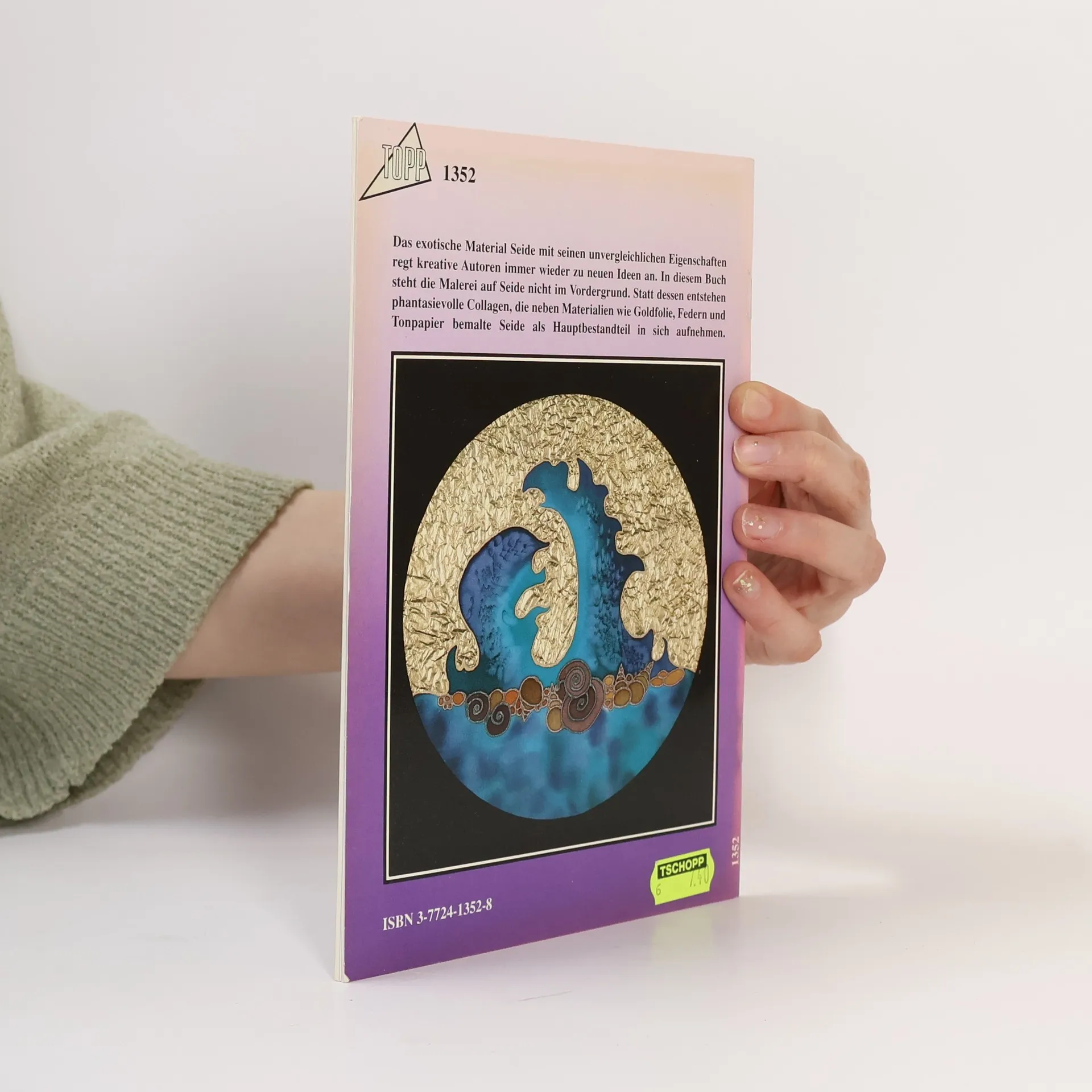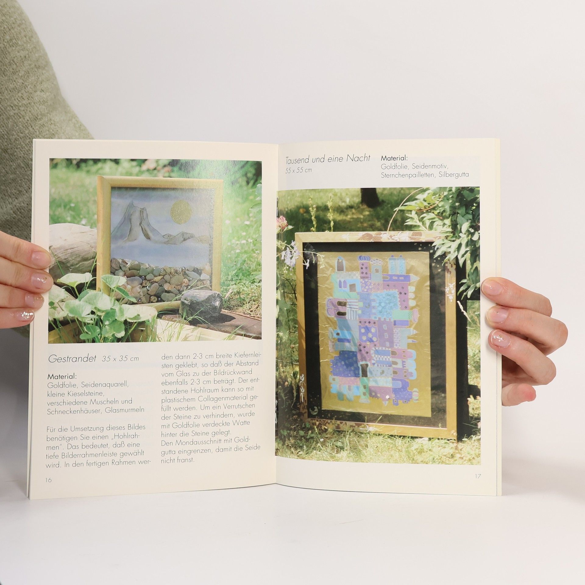 Vorschläge und (Schritt-für-Schritt-)Anleitungen zur Herstellung phantasievoller Gebilde unter Verwendung verschiedenster Materialien (Goldfolie, Federn, Korallen u.a.) in Kombination mit bemalter Seide; reich illustriert.
