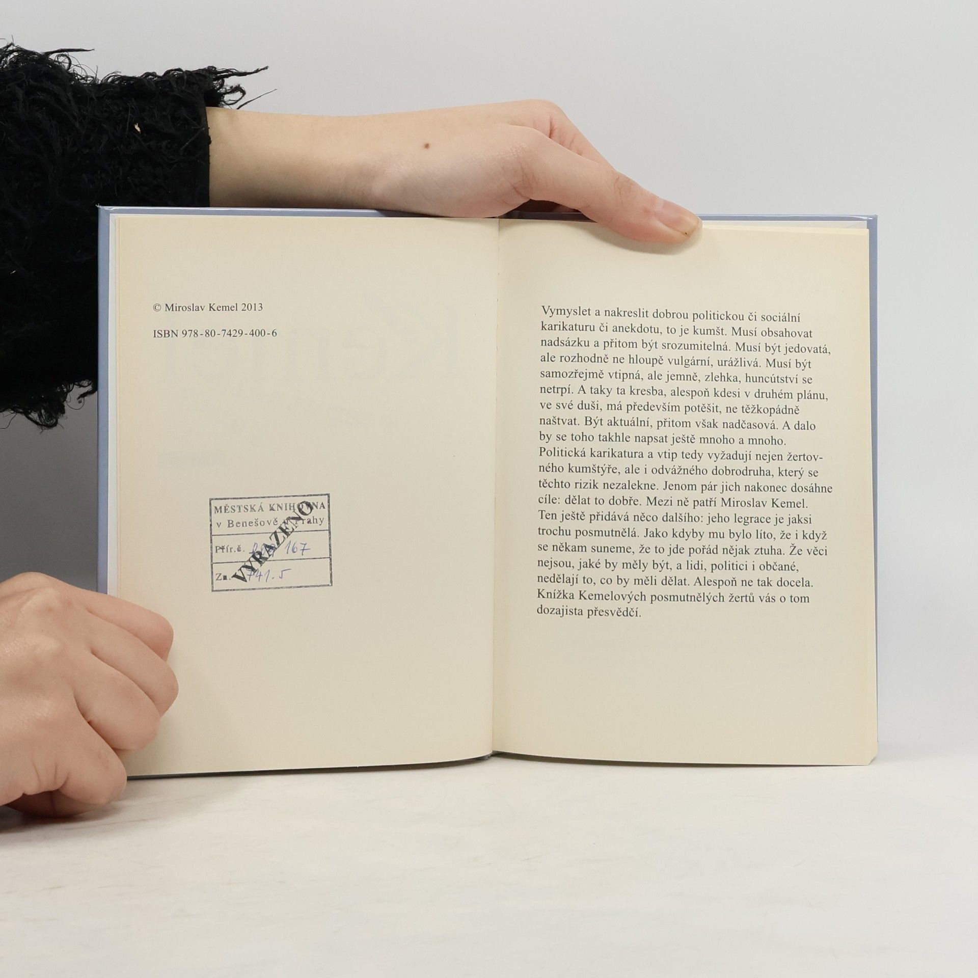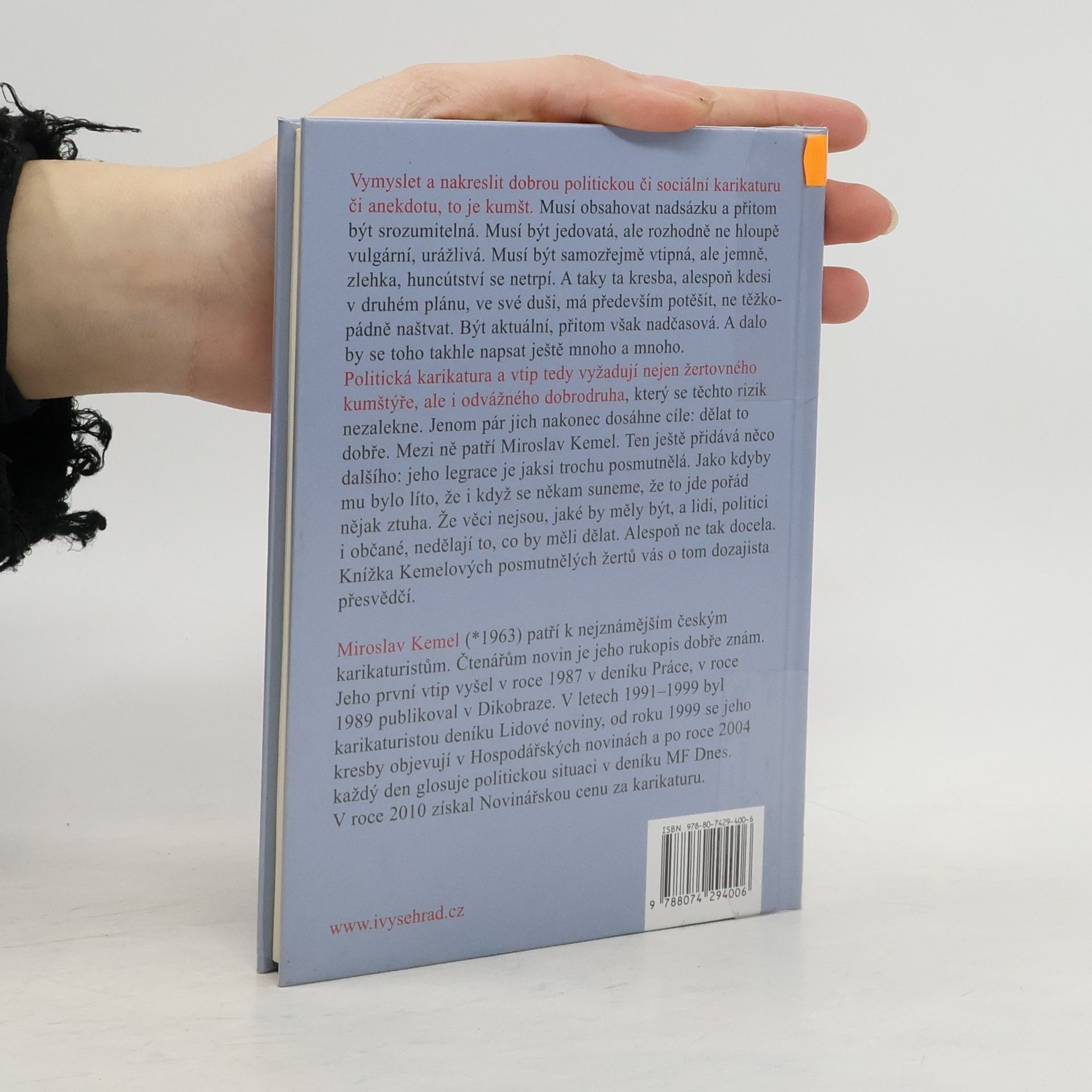 Karikatury Miroslava Kemela každý den v MF Dnes. Vymyslet a nakreslit dobrou politickou či sociální karikaturu či anekdotu, to je kumšt. Musí obsahovat nadsázku a přitom být srozumitelná. Musí být jedovatá, ale rozhodně ne hloupě vulgární, urážlivá. Musí být samozřejmě vtipná, ale jemně, zlehka, huncútství se netrpí. A taky ta kresba, alespoň kdesi v druhém plánu, ve své duši, má především potěšit, ne těžkopádně naštvat. Být aktuální, přitom však nadčasová. A dalo by se toho takhle napsat ještě mnoho a mnoho. Politická karikatura a vtip tedy vyžadují nejen žertovného kumštýře, ale i odvážného dobrodruha, který se těchto rizik nezalekne. Jenom pár jich nakonec dosáhne cíle: dělat to dobře. Mezi ně patří Miroslav Kemel. Ten ještě přidává něco dalšího: jeho legrace je jaksi trochu posmutnělá. Jako kdyby mu bylo líto, že i když se někam suneme, že to jde pořád nějak ztuha. Že věci nejsou, jaké by měly být, a lidi, politici i občané, nedělají to, co by měli dělat. Alespoň ne tak docela. Knížka Kemelových posmutnělých žertů vás o tom dozajista přesvědčí.
