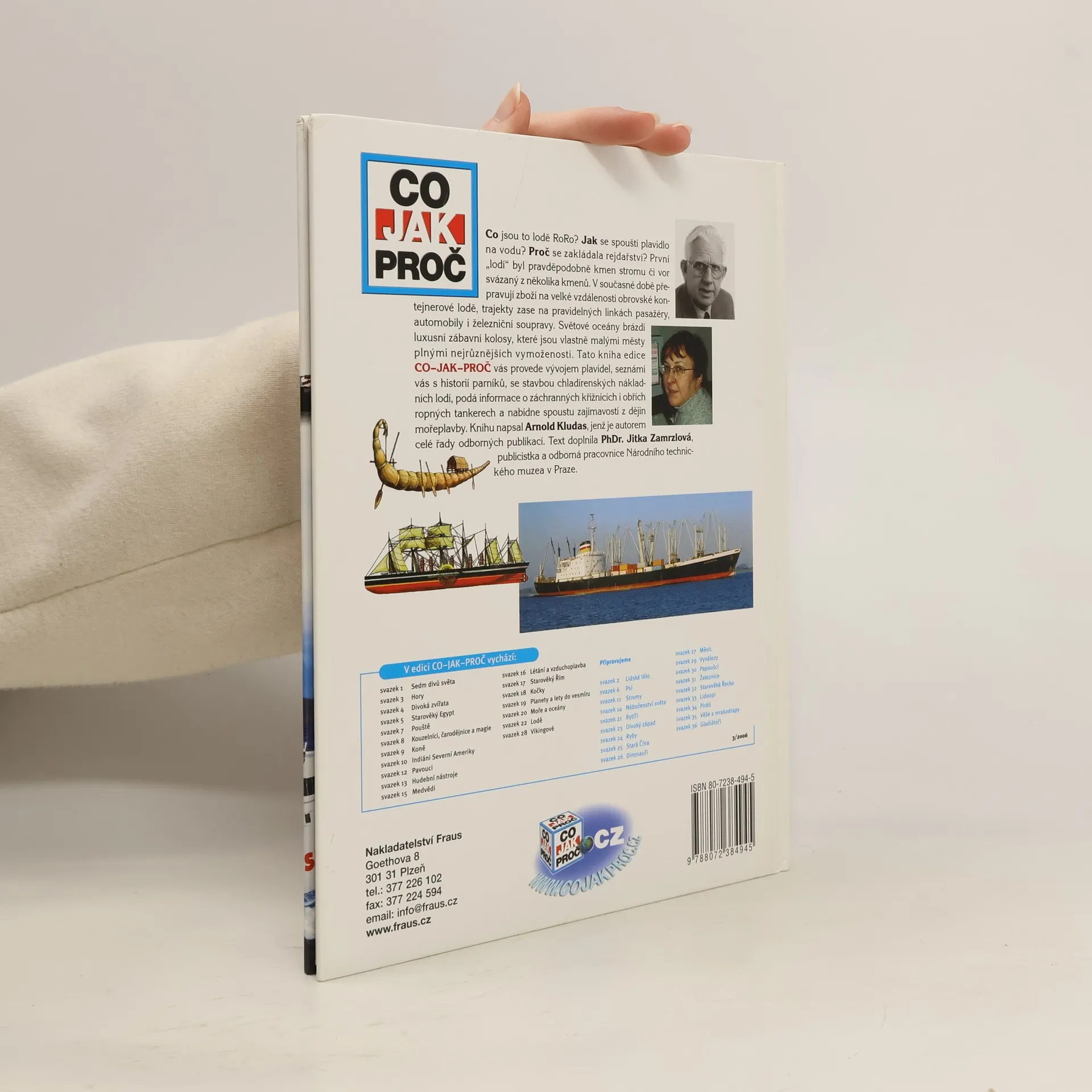 Co jsou „kontejnerové lodě“? Jak se spouští loď na vodu? Proč se zakládala rejdařství? Prvním plavidlem člověka byl pravděpodobně kus dřeva. Dnes máme kontejnerové lodě, které přepravují zboží na velké vzdálenosti. Trajekty zajišťují rychlé dopravní spojení přes moře. Turisté tráví dovolenou na luxusních prázdninových lodích. Tato kniha z edice CO-JAK-PROČ provede čtenáře od vzrušující doby plachetnic až k dnešnímu grandióznímu vývoji techniky, přiblíží například rozvoj parníků, stavbu chladírenských nákladních lodí, záchranných křižníků i obrovských ropných tankerů. Fascinující historii mezinárodní námořní dopravy vypráví zasvěceně a s mnoha souvisejícími informacemi autor četných odborných knih Arnold Kludas a doplňuje ho odborná pracovnice Národního technického muzea v Praze a publicistka PhDr. Jitka Zamrzlová.