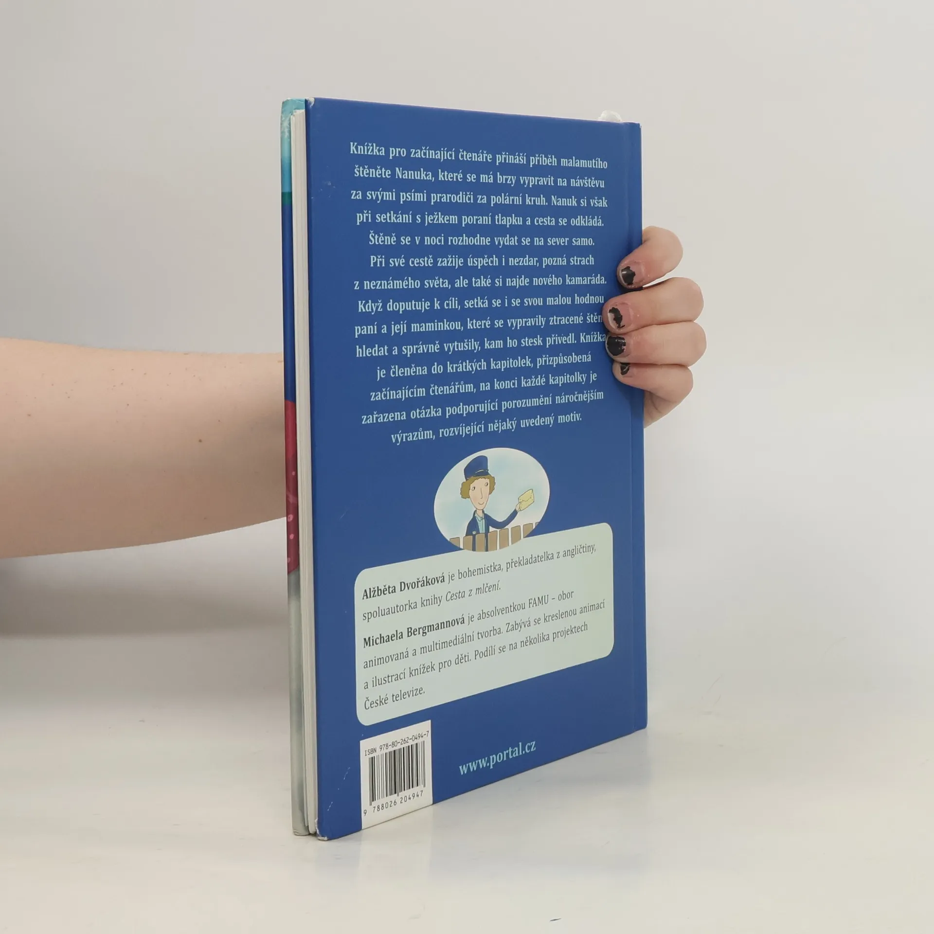 Podtitul: První čtení, to nic není / Knížka pro začínající čtenáře přináší příběh malamutího štěněte Nanuka, které se má brzy vypravit na návštěvu za svými psími prarodiči za polární kruh. Nanuk si však při setkání s ježkem poraní tlapku a cesta se odkládá. Štěně se však v noci rozhodne vypravit se na sever samo. Při své cestě zažije úspěch i nezdar, pozná strach z neznámého světa, ale také si najde nového kamaráda. Když doputuje k cíli, setká se i se svou malou hodnou paní a její maminkou, které se vypravily ztracené štěně hledat a správně vytušily, kam ho stesk přivedl. Knížka je členěna do krátkých kapitolek, přizpůsobená začínajícím čtenářům, na konci každé kapitolky jsou zařazeny otázky, motivující k porozumění náročnějším výrazům, rozvíjející nějaký uvedený motiv… Alžběta Dvořáková je bohemistka, překladatelka z angličtiny, spoluautorka knihy Cesta z mlčení.