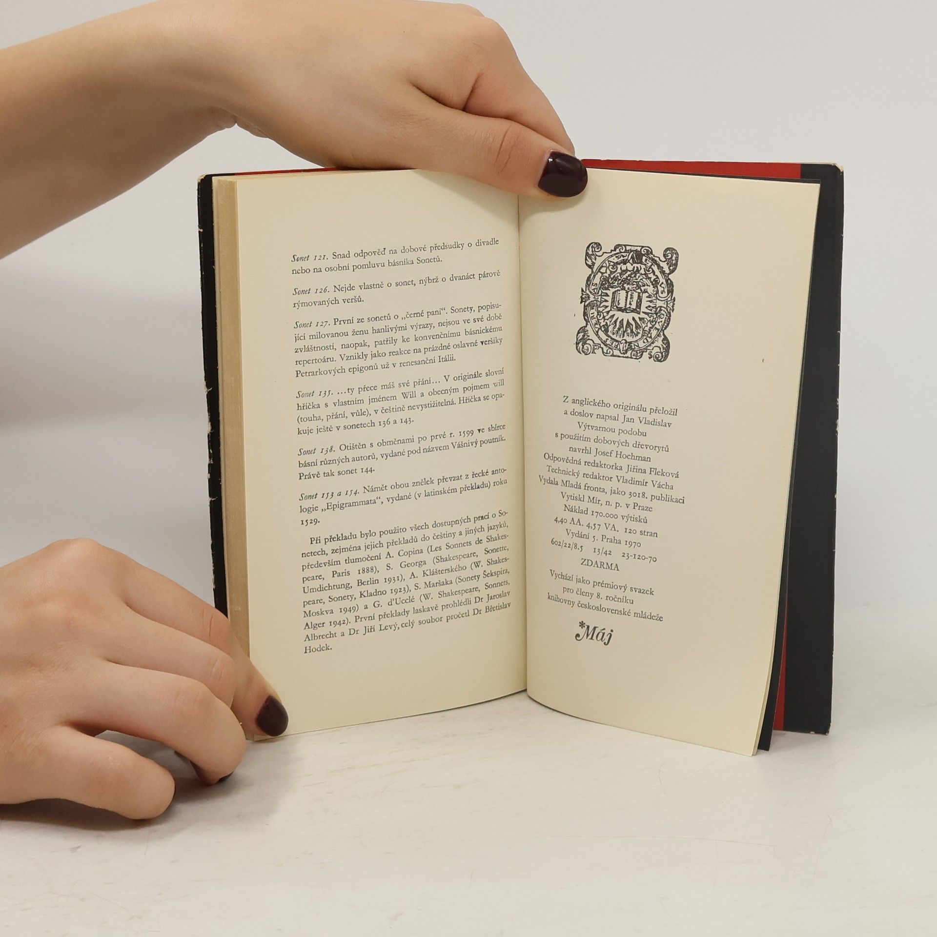 Páté vydání 154 Shakespearových sonetů, tentokrát v překladu Jana Vladislava. Prémiový svazek 8. ročníku edice Máj.