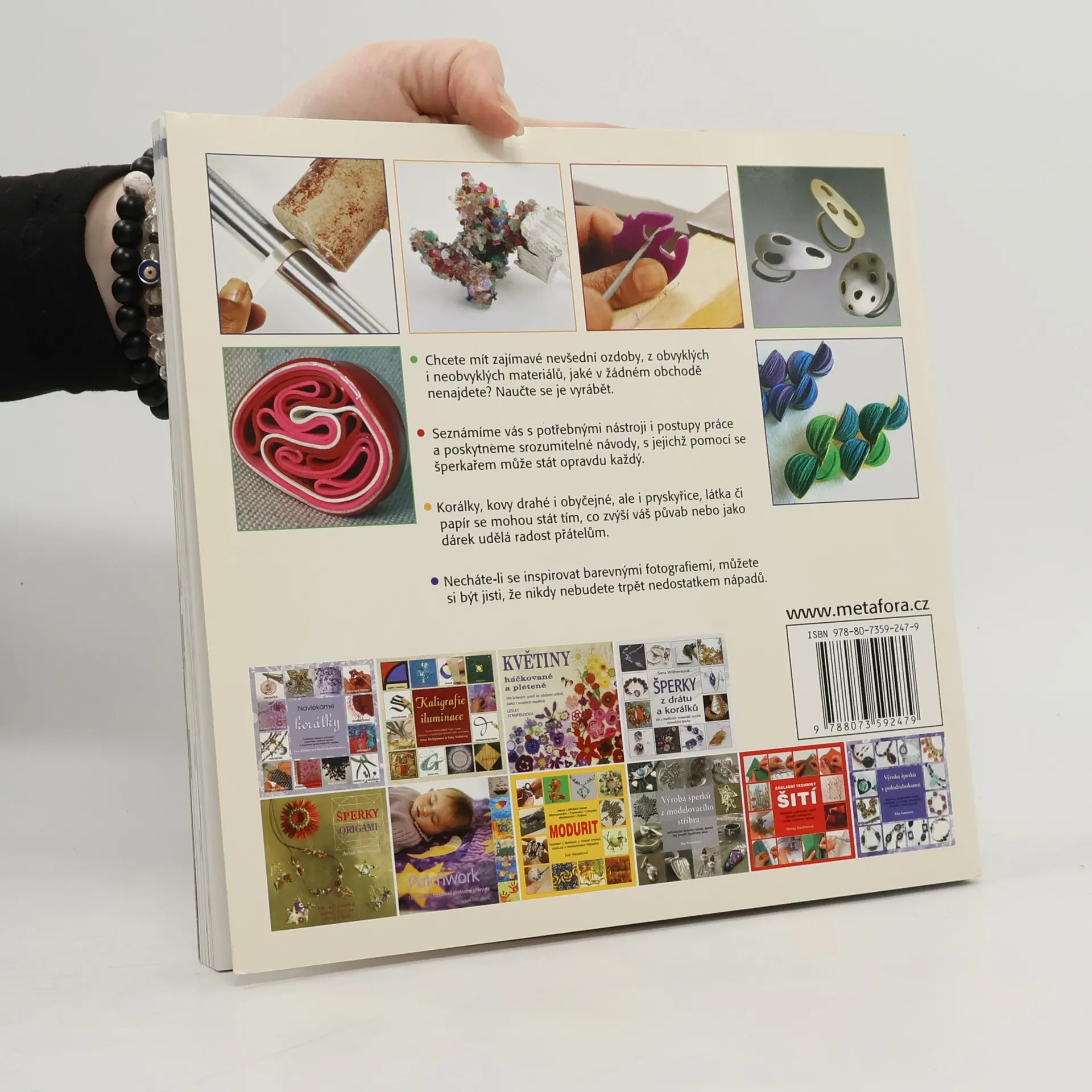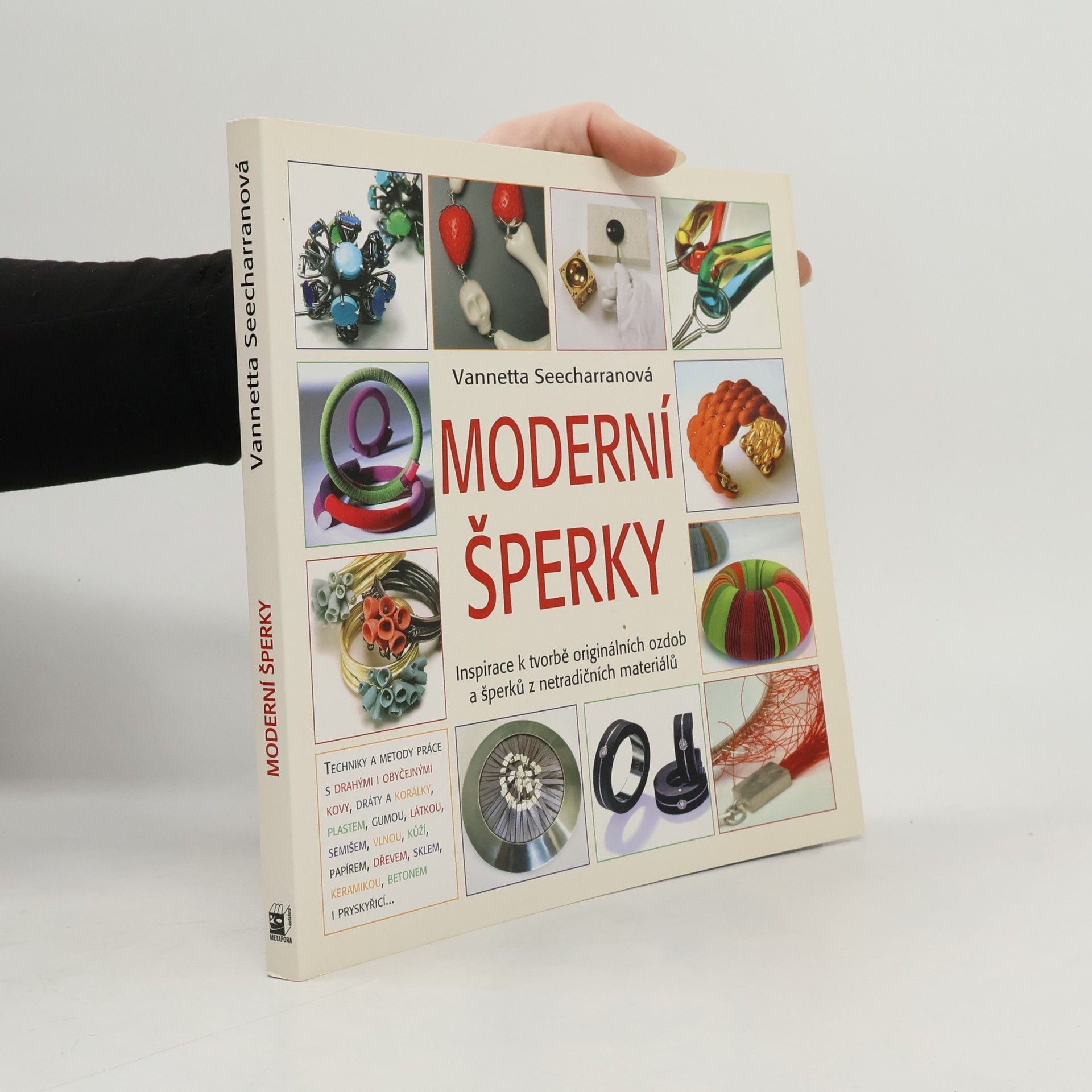 Inspirace k tvorbě originálních ozdob a šperků z netradičních materiálů Techniky a metody práce s drahými i obyčejnými kovy, dráty a korálky, plastem, gumou, látkou, semišem, vlnou, kůží, papírem, dřevem, sklem, keramikou, betonem i pryskyřicí... Chcete mít zajímavé nevšední ozdoby, z obvyklých i neobvyklých materiálů, jaké v žádném obchodě nenajdete? Naučte se je vyrábět. Seznámíme vás s potřebnými nástroji i postupy práce a poskytneme srozumitelné návody, s jejichž pomocí se šperkařem může stát opravdu každý. Korálky, kovy drahé i obyčejné, ale i pryskyřice, látka či papír se mohou stát tím, co zvýší váš půvab nebo jako dárek udělá radost přátelům. Necháte-li se inspirovat barevnými fotografiemi, můžete si být jisti, že nikdy nebudete trpět nedostatkem nápadů.