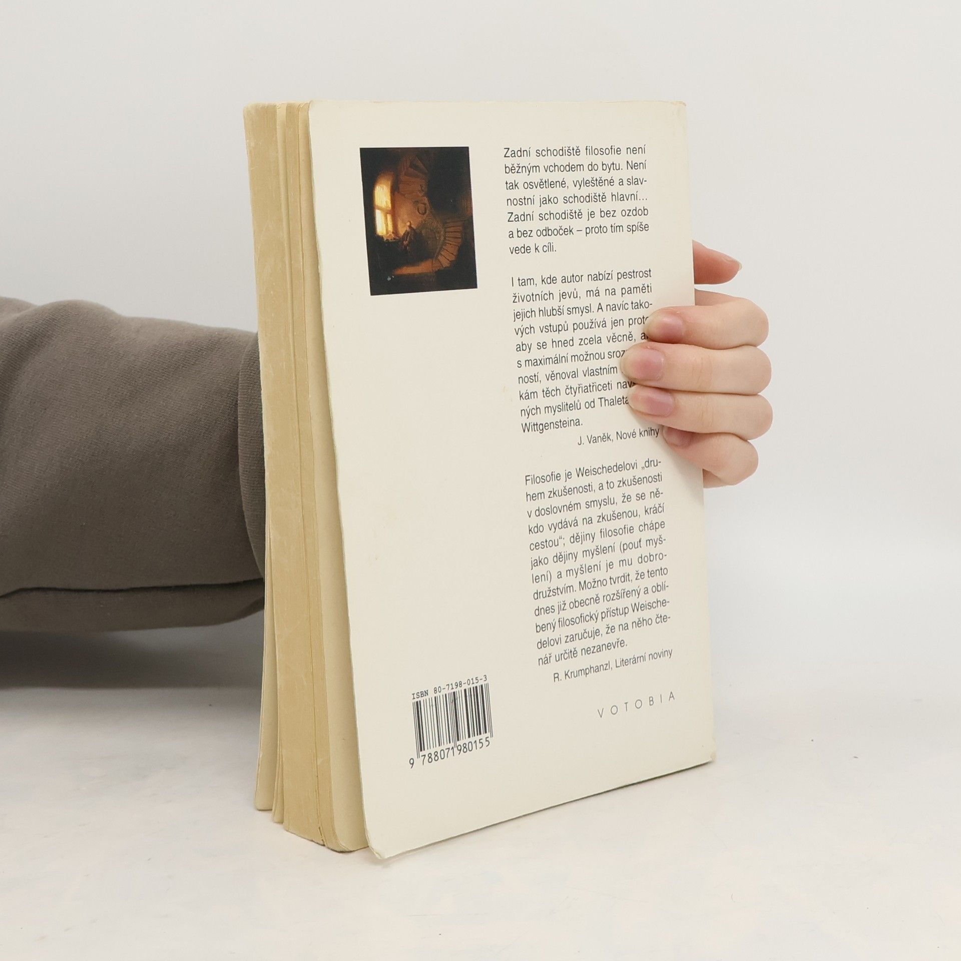 Zadní schodiště představuje alternativní, neformální přístup k bytu, odlišný od hlavního, slavnostního vchodu. Je prosté, někdy zanedbané, a umožňuje vstup bez zvláštního oblečení. I po tomto schodišti lze dosáhnout stejného cíle: setkání s lidmi uvnitř. Podobně i k filosofii můžeme přistupovat neformálně, bez okázalosti. Zadní schody k filosofii umožňují, abychom přišli takoví, jací jsme, a setkali se s mysliteli v jejich pravé podobě, bez očekávání vznešeného hosta. Tímto způsobem můžeme poznat jejich lidské slabosti i snahy překonat obyčejnost. Pokud se rozhodneme pro tento neformální přístup, musíme být připraveni na vážný rozhovor. Ti, kteří preferují tradiční, vznešený postoj k filosofii, mohou autorův přístup odmítnout, ale zadní schodiště nabízí přímější cestu k cíli. Na hlavním schodišti se často ztrácíme v okrasách a zdobných prvcích, zatímco zadní schodiště je bez ozdob a odboček, což usnadňuje přístup k podstatě věci. Tímto způsobem se dostáváme blíže k filosofickým myšlenkám a lidem, kteří je vyjadřují.