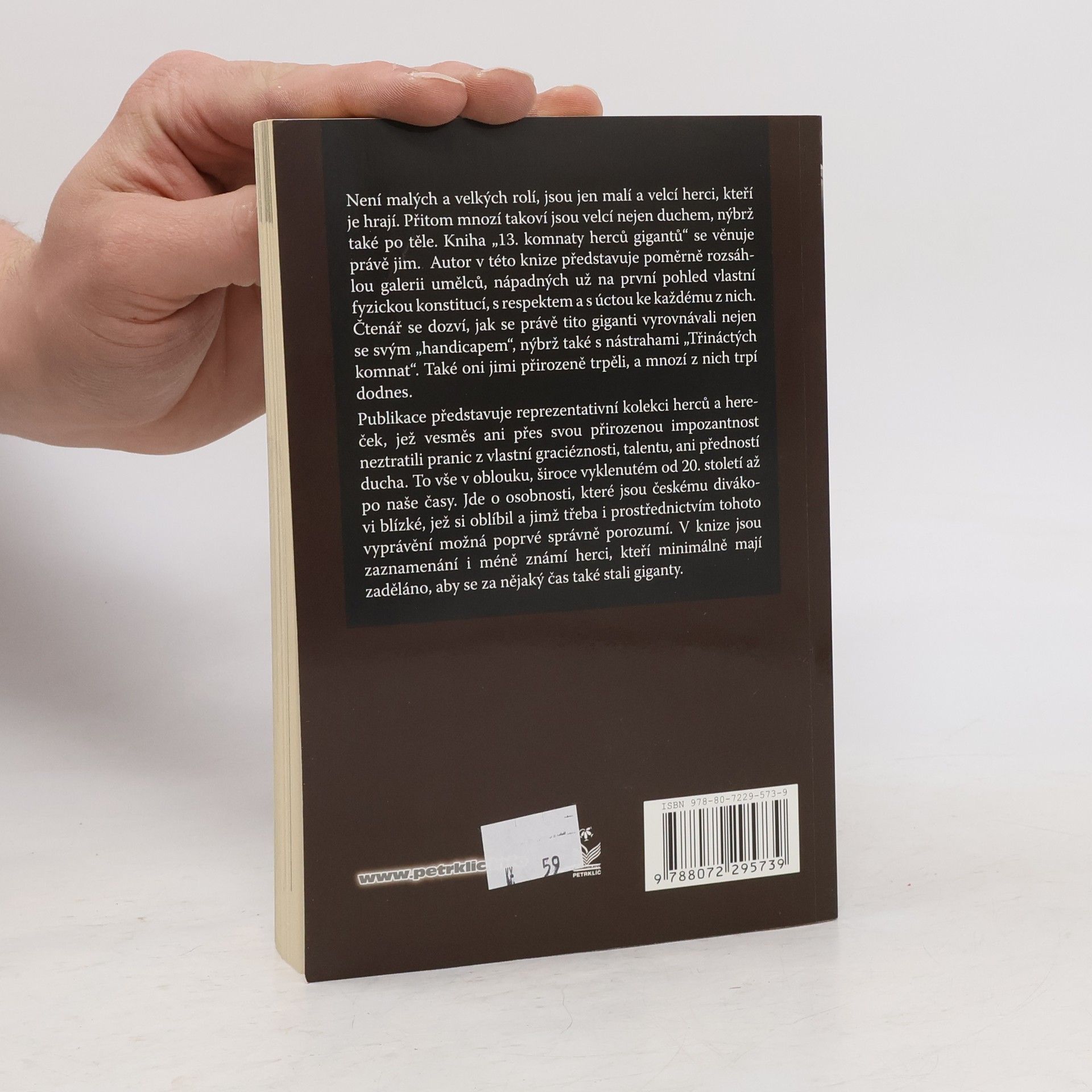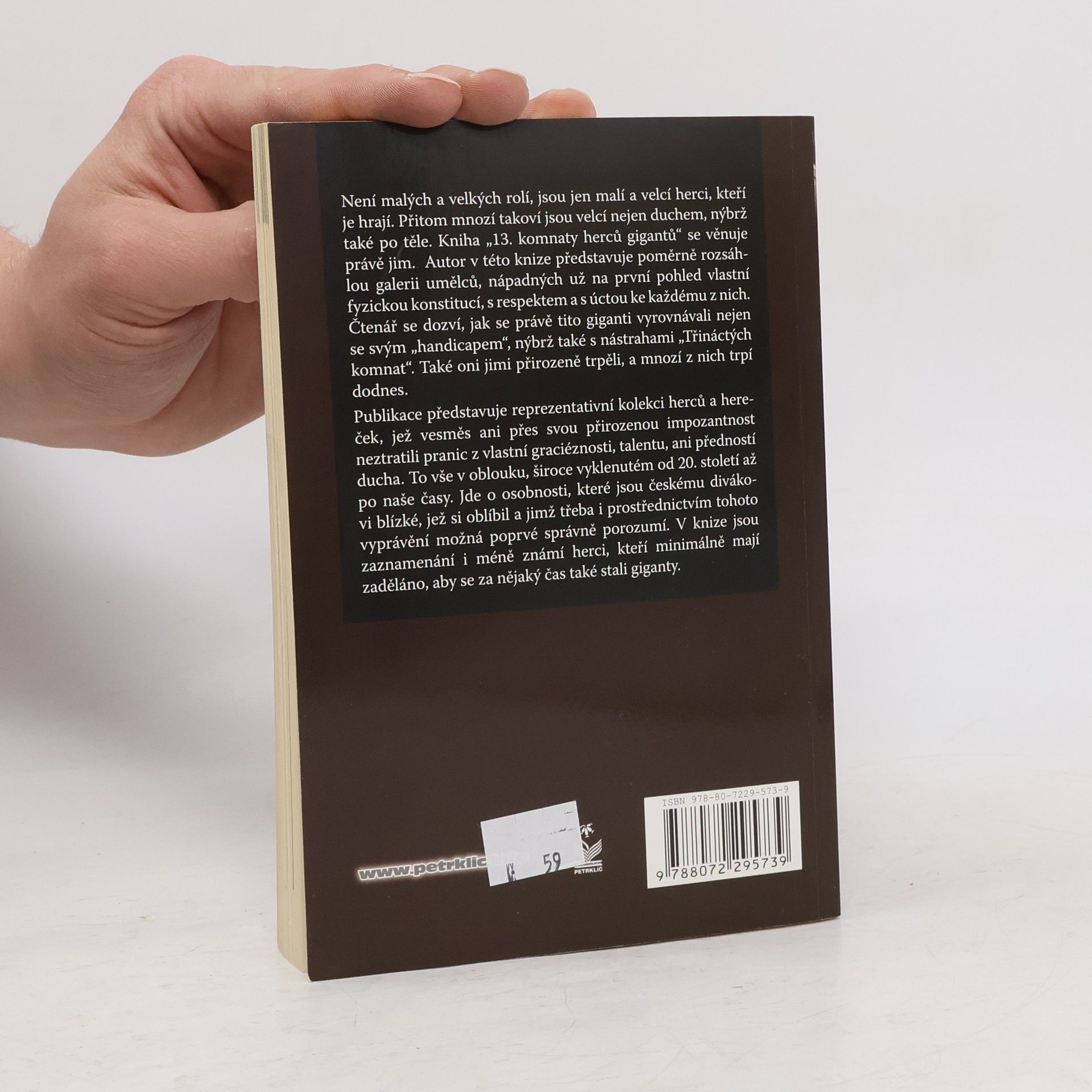 Není malých a velkých rolí, jsou jen malí a velcí herci, kteří je hrají. Přitom mnozí takoví jsou velcí nejen duchem, nýbrž také po těle. Kniha „13. komnaty herců gigantů“ se věnuje právě jim. Autor v této knize představuje poměrně rozsáhlou galerii umělců, nápadných už na první pohled vlastní fyzickou konstitucí, s respektem a s úctou ke každému z nich. Čtenář se dozví, jak se právě tito giganti vyrovnávali nejen se svým „handicapem“, nýbrž také s nástrahami „Třináctých komnat“. Také oni jimi přirozeně trpěli, a mnozí z nich trpí dodnes. Publikace představuje reprezentativní kolekci herců a hereček, jež vesměs ani přes svou přirozenou impozantnost neztratili pranic z vlastní graciéznosti, talentu, ani předností ducha. To vše v oblouku, široce vyklenutém od 20. století až po naše časy. Jde o osobnosti, které jsou českému divákovi blízké, jež si je oblíbil a jimž třeba i prostřednictvím tohoto vyprávění možná poprvé správně porozumí. V knize jsou zaznamenání i méně známí herci, kteří minimálně mají zaděláno, aby se za nějaký čas také stali giganty.