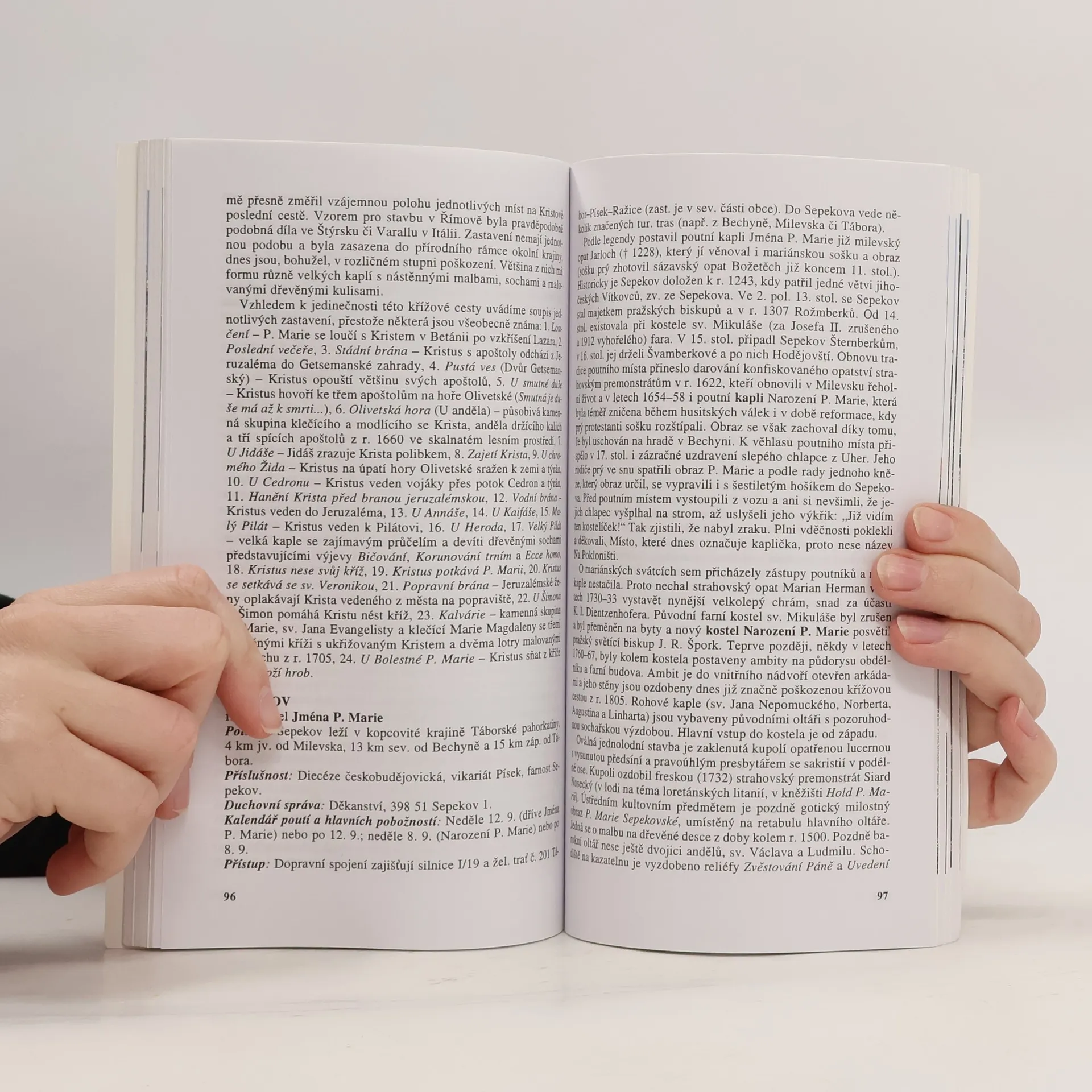 Po stručném úvodu o tradici i obnovení starých poutních míst následuje vlastní soupis lokalit. Začíná Prahou a v abecedním pořadí uvádí soupis míst, která souvisejí s náboženskými poutěmi. Pak následují střední, jižní, západní, severní a východní Čechy s obdobným uspořádáním - v každém kraji soupis v abecedním pořadí podle názvů jednotlivých míst. Hesla uvádějí stručnou historii a popis místa; to vše je ještě doplněno praktickými informacemi, které se týkají duchovní správy a přístupových cest. Na závěr textu je připojen stručný slovníček odborných pojmů. Celou knihu doprovázejí četné fotografie nejznámějších, ale i méně známých poutních míst.... celý text