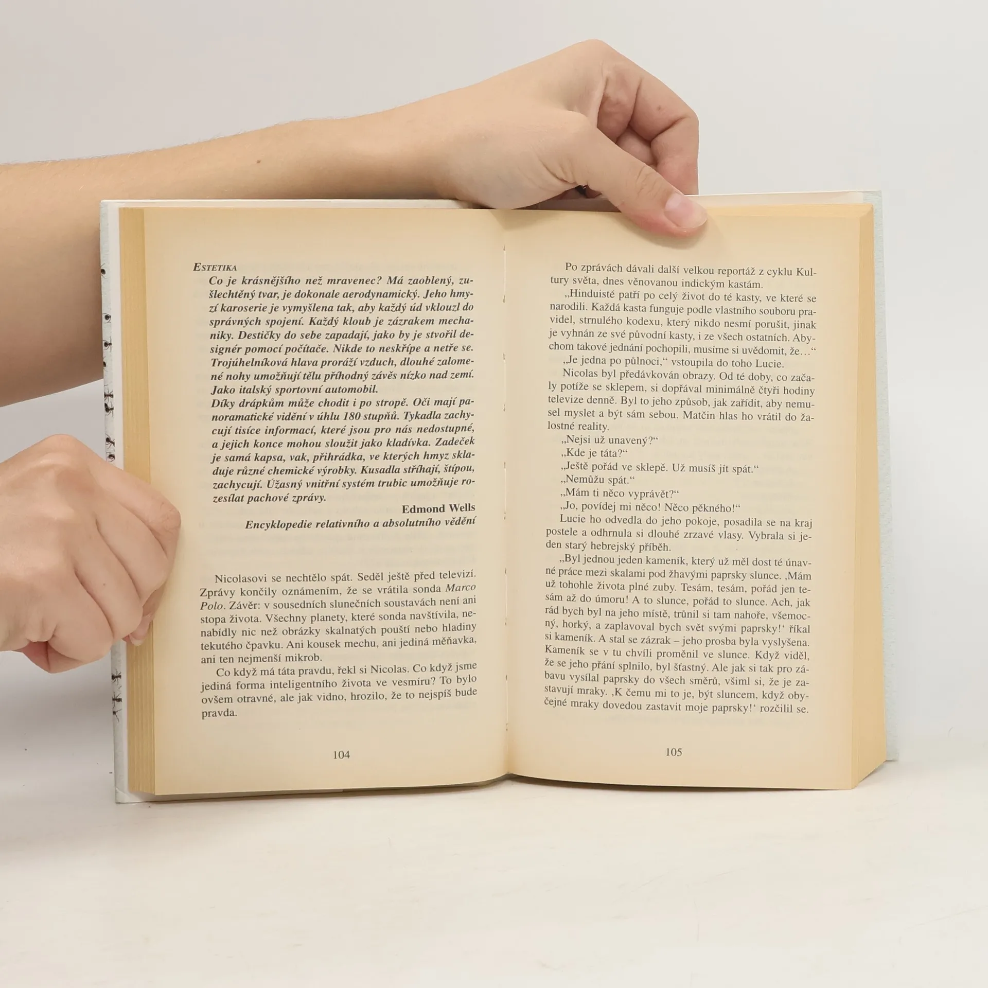 Dávejte pozor, kam šlapete! Během několika vteřin, které potřebujete k přečtení tohoto odstavce, se narodí 40 lidí… a 700 milionů mravenců. Malí, pro nás takřka neviditelní, a přesto úchvatní tvoři vytvořili od doby, kdy se před stovkou milionů let na Zemi objevili, zcela dokonalou a všestranně fungující civilizaci. Budují města a federace, bojují o území, společnými silami odrážejí útoky vetřelců a predátorů. Zakládají houbová políčka nebo mšičí farmy a svá hnízda dokážou utkat z listí. Vyznávají kastovní systém a některé druhy si otrokářským způsobem podrobují jiné. Přestože představivost lidí vždy s oblibou hledala paralelní světy po nejrůznějších koutech vesmíru, na fantastickou existenci těch, kteří žijí v poloskrytu pod našima nohama, se zapomínalo. Jsou mravenci anarchisté, roajalisté anebo se jejich organizace blíží totalitnímu zřízení? Jak chápou čas? Co o nich vlastně víme? A vědí oni o nás? Werberův román Mravenci bývá právem označován jako realistická sci-fi: to nejúžasnější je na něm právě to, co je skutečné. Po jeho přečtení už nikdy nebudete vnímat svět tak jako dosud - stejně jako hrdina knihy, nezaměstnaný pařížský zámečník Jonathan Wells, který po svém excentrickém strýci zdědil suterénní byt a tajemné varování: Hlavně nikdy nechoď do sklepa!