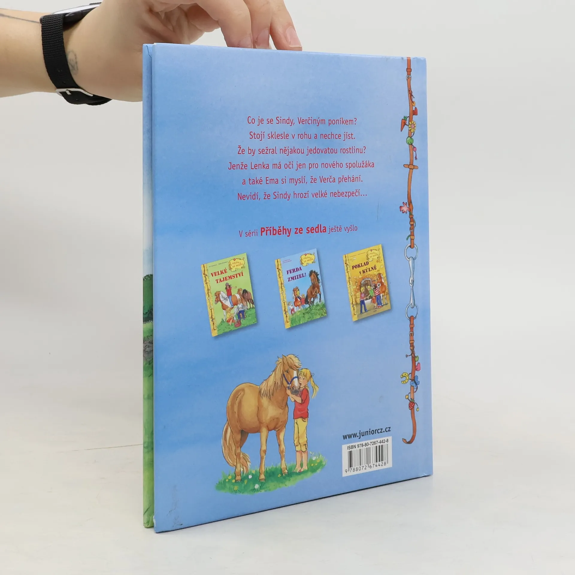 V sérii Příběhy ze sedla vychází povídání o třech holkách a jejich zvířecích kamarádech. Co je se Sindy, Verčiným poníkem? Stojí sklesle v rohu a nechce jíst. Že by sežral nějakou jedovatou rostlinu? Jenže Lenka má oči jen pro nového spolužáka a také Ema si myslí, že Verča přehání. Nevidí, že Sindy hrozí velké nebezpečí…