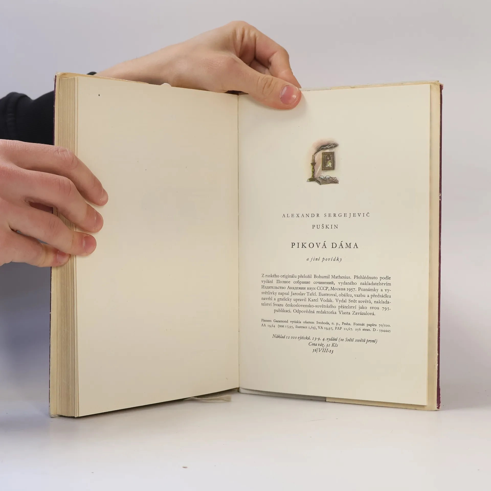 Alexandr Sergejevič Puškin: Piková dáma a jiné povídky. Rok 1960, 4. vydání (ve Světě sovětů první), česky, vydal: Svět sovětů, nakladatelství Svazu československo-sovětského přátelství. Jedná se o následující povídky: 1.) Povídky nebožtíka Ivana Petroviče Bělkina (Výstřel, Metelice, Majitel pohřebního ústavu, Staniční dozorce, Slečna selka) 2.) Dubrovskij 3.) Piková dáma 4.) Kyrdžali 5.) Kapitánská dcerka (Gardový seržán, Průvodce, Pevnost, Souboj, Láska, Vzpoura Pugačovova, Zteč, Nezvaný host, Rozloučení, Obléhání města, Ve vzbouřené vsi, Sirotek, Vězení, Soud).