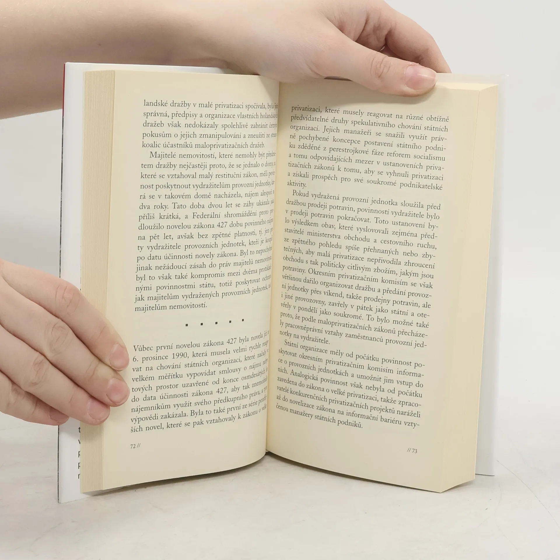 Kniha Tomáše Ježka podrobně mapuje celý proces české privatizace, jak probíhala především v devadesátých letech. Autor ji chápe a pojednává jako základ transformace tzv. socialistické společnosti na společnost svobodných lidí, která spočívá v historicky ojedinělé operaci převádění obrovského státního majetku na soukromé subjekty za účelem vytváření svobodného trhu. Autor provází čtenáře vtipným a srozumitelným způsobem jednotlivými kroky tohoto procesu - od vyjasňování ideových východisek a bojů o smysl, základní cíle a metody privatizace přes konkrétní průběh tzv. malé privatizace, velké privatizace, a zejména pak privatizace kuponové až k úloze jednotlivých institucí a osob. Tomáš Ježek je průvodcem vskutku zasvěceným, neboť podává svědectví takříkajíc z první ruky. Nejenže se za starého režimu de facto jako ekonom teoreticky připravoval na danou problematiku - mj. pro samizdat přeložil práce F. A. von Hayeka -, ale po převratu se mu dostalo možnosti uskutečňovat své teoretické představy v praxi, ať už jako ministr privatizace, předseda Fondu národního majetku, předseda rozpočtového výboru sněmovny či burzovní komory.