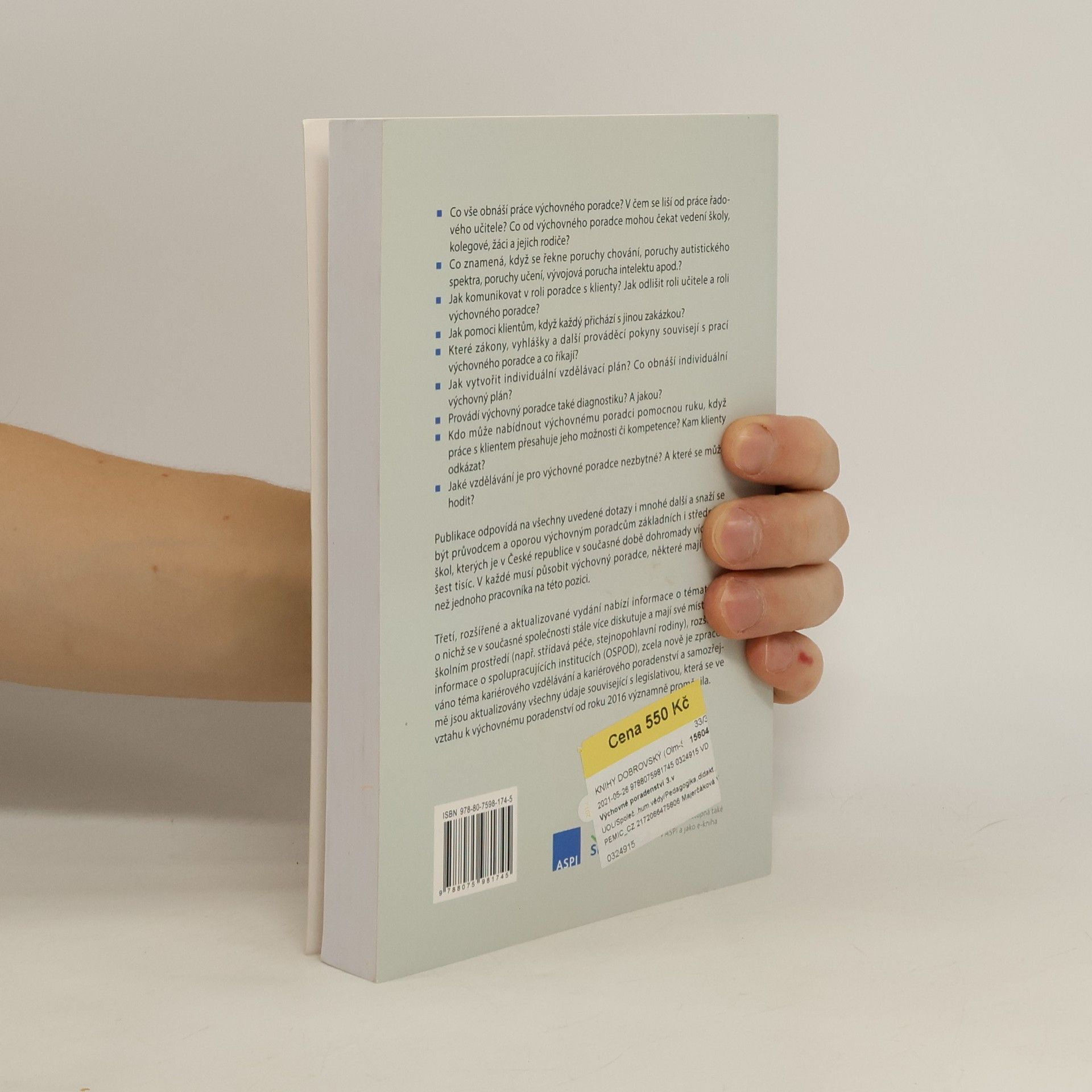 Co vše obnáší práce výchovného poradce? Jak se liší od učitele? Jaké očekávání mají vedení školy, kolegové, žáci a rodiče? Jaké jsou poruchy chování, autistického spektra, učení a lehká mentální retardace? Jak poradce komunikuje s klienty a jak odlišuje své role? Jak pomoci různým klientům s jejich specifickými potřebami? Jaké zákony a vyhlášky se vztahují k práci poradce? Jak vytvořit individuální vzdělávací a výchovný plán? Provádí poradce diagnostiku a jakou? Kdo může poradci pomoci, když jeho kompetence nestačí? Jaké vzdělání je pro výchovné poradce nezbytné a co se může hodit? Tato publikace odpovídá na všechny tyto otázky a mnohé další, slouží jako průvodce a opora výchovným poradcům na základních a středních školách v České republice, kde jich je více než 6000. Třetí, rozšířené a aktualizované vydání se zaměřuje na aktuální témata, jako je střídavá péče a stejnopohlavní rodiny, a rozšiřuje informace o spolupráci s OSPOD. Nově zpracovává téma kariérového vzdělávání a poradenství a aktualizuje legislativní údaje, které se od předchozího vydání významně změnily.