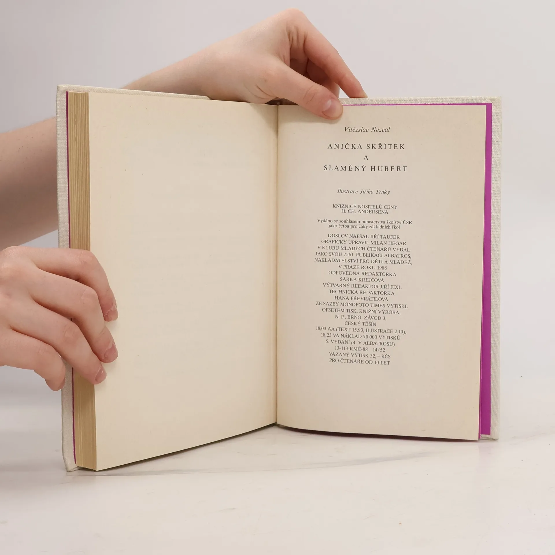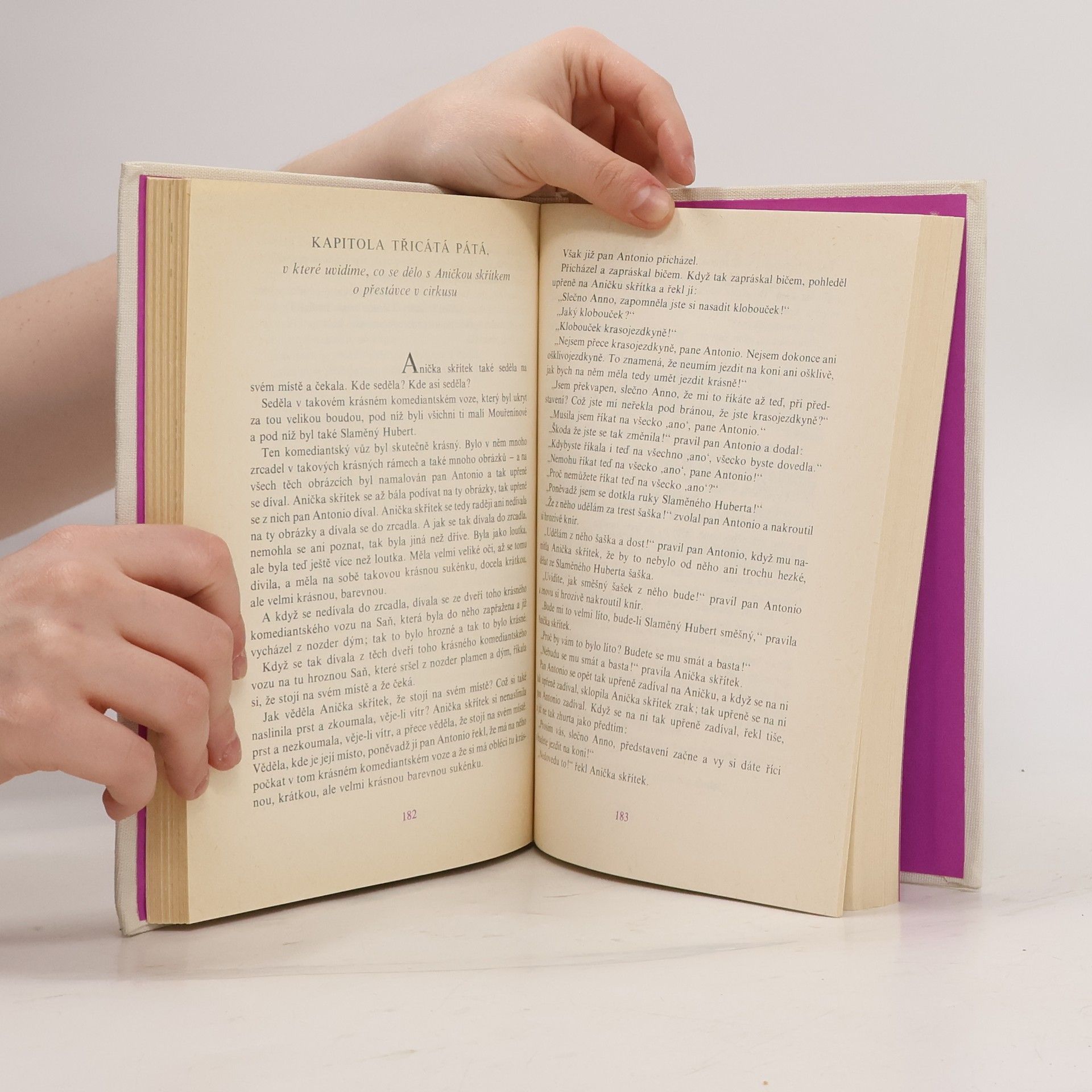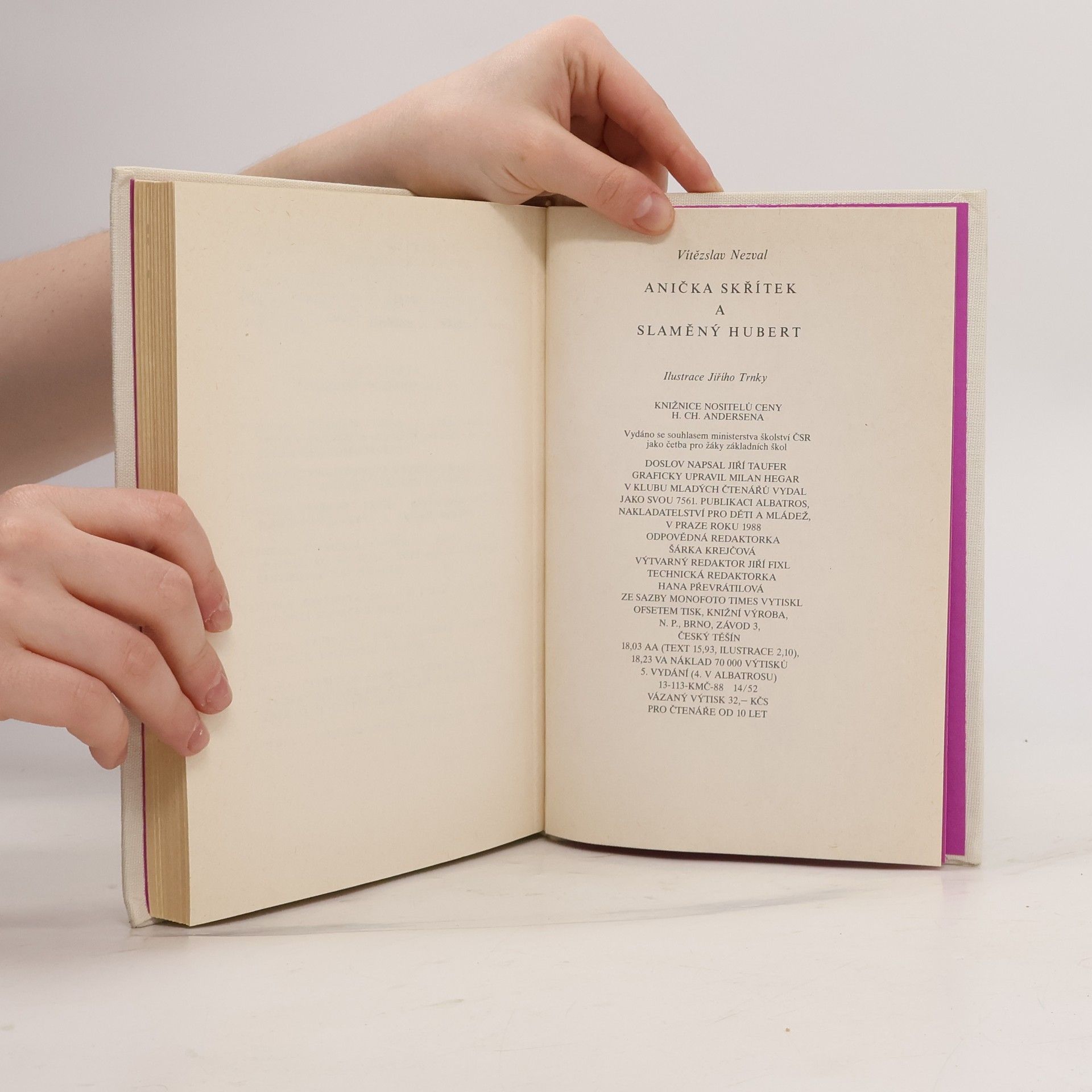 Staženo z netu - překrásný popis knihy: Přestože ve veřejné knihovně naleznete tuto pohádku v přihrádce pro děti do 10 let, jedná se o knihu, která rozhodně není určená jen pro děti. Anička Skřítek se dostává z venkova do města, kde se s dětskou bezelstnou naivitou všemu obdivuje.Potkává Slaměného Huberta a spolu s ním se ztratí v zrcadlech výkladní skříně. Sugestivní vyprávění o světě, kde žijí Zulukapříci, Mouřenínové a zběsilé kuří nohy, kde všechno je chvíli tak a pak naopak, vás pohltí na několik desítek stránek a i po dočtení knihy budete mít pocit, že jste v myšlenkách uvízli v krajině, kde se úzkost políbila s fantazií. Svazek edičně připravil a ediční poznámku napsal dr. Milan Blahynka.