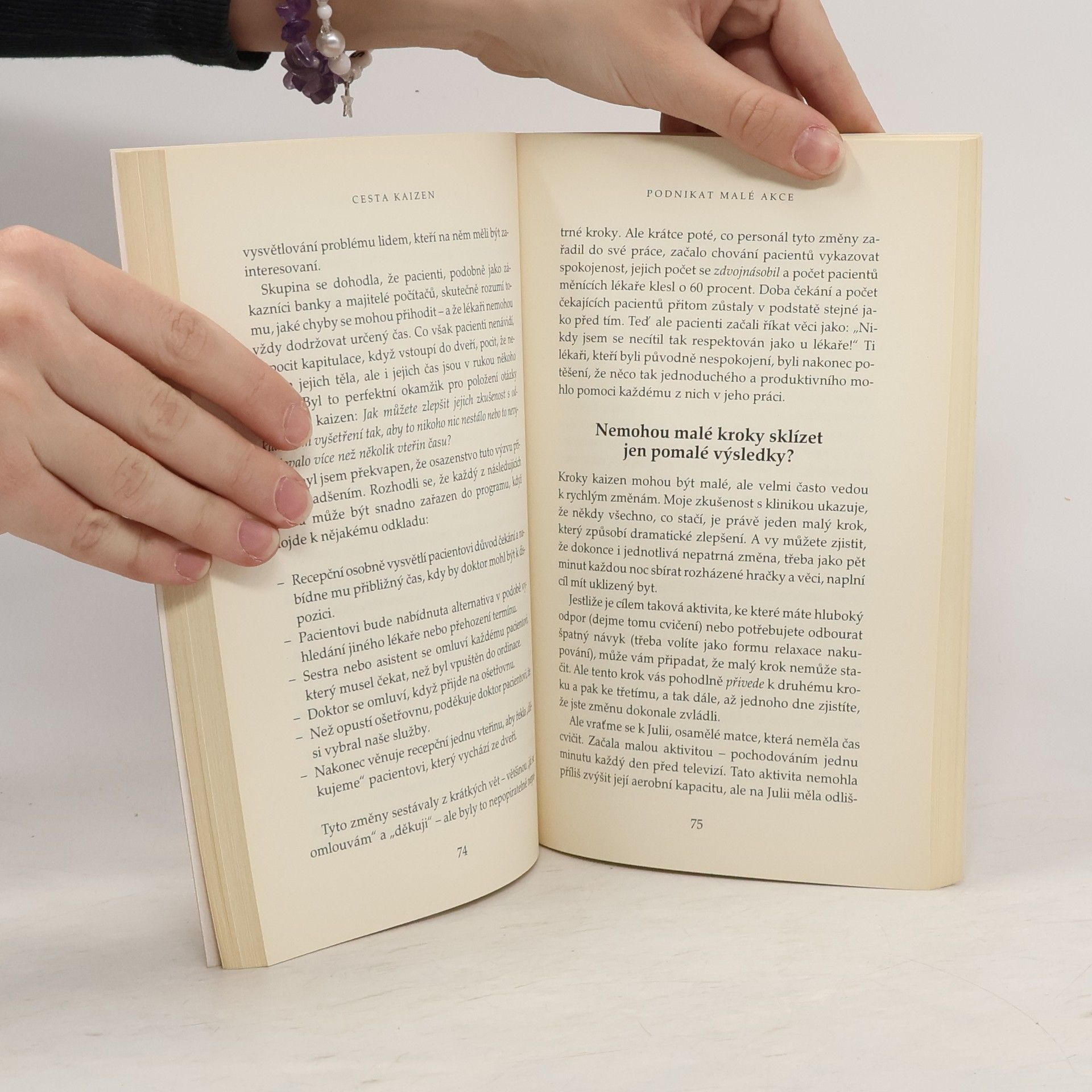 Z malého kroku k velkému skoku Nenásilná, jemná japonská metoda kaizen je založena na prosté myšlence - velkých změn lze dosáhnout malými kroky. Kaizen lze použít pro zlepšování kvalit života - ať už jde o detaily nebo o celkový posun vpřed. Kontinuálním zlepšováním pomocí malých kroků a setrvalého soustředění na malé akce, myšlenky, otázky a maličkosti, lze proniknout ke skutečnému mistrovství ve všech náležitostech života. Technika je jednoduchá a spočívá v těchto bodech: - klaďte malé otázy - zabývejte se malými myšlenkami - podnikejte malé akce - řešte malé problémy Cílem je měnit beze strachu a selhání svůj život. Výsledek vás překvapí.