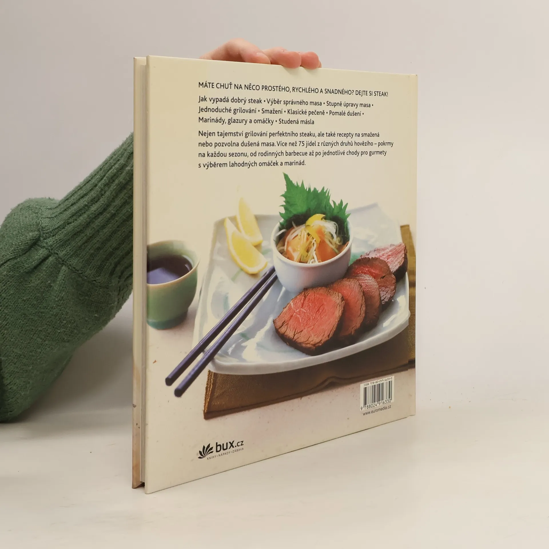 Od T-bone steaku přes chateaubriand pečený v solné krustě až k filetu mignon se šalotkou. Máte chuť na něco prostého, rychlého a snadného? Všechny tyto atributy splňuje steak! Není to vůbec obtížné: naučíte se vybrat správně maso, odhadnout stupeň propečení, dobře grilovat, smažit či připravit klasické pečeně. Více než 75 jídel z různých druhů hovězího pokrmy na každou sezonu, od rodinných barbecue až po jednotlivé chody pro gurmety s výběrem lahodných omáček, marinád i studených ochucených másel.