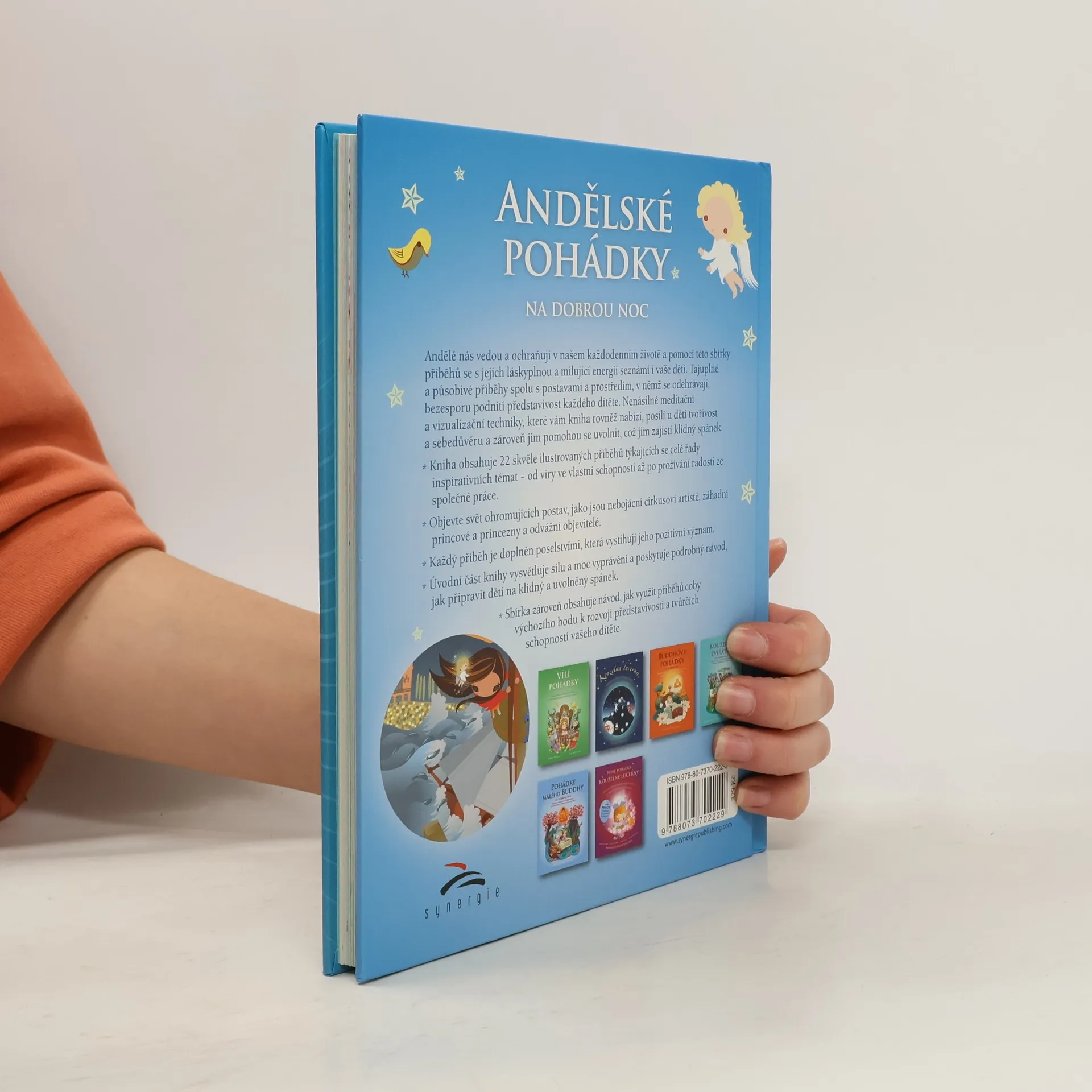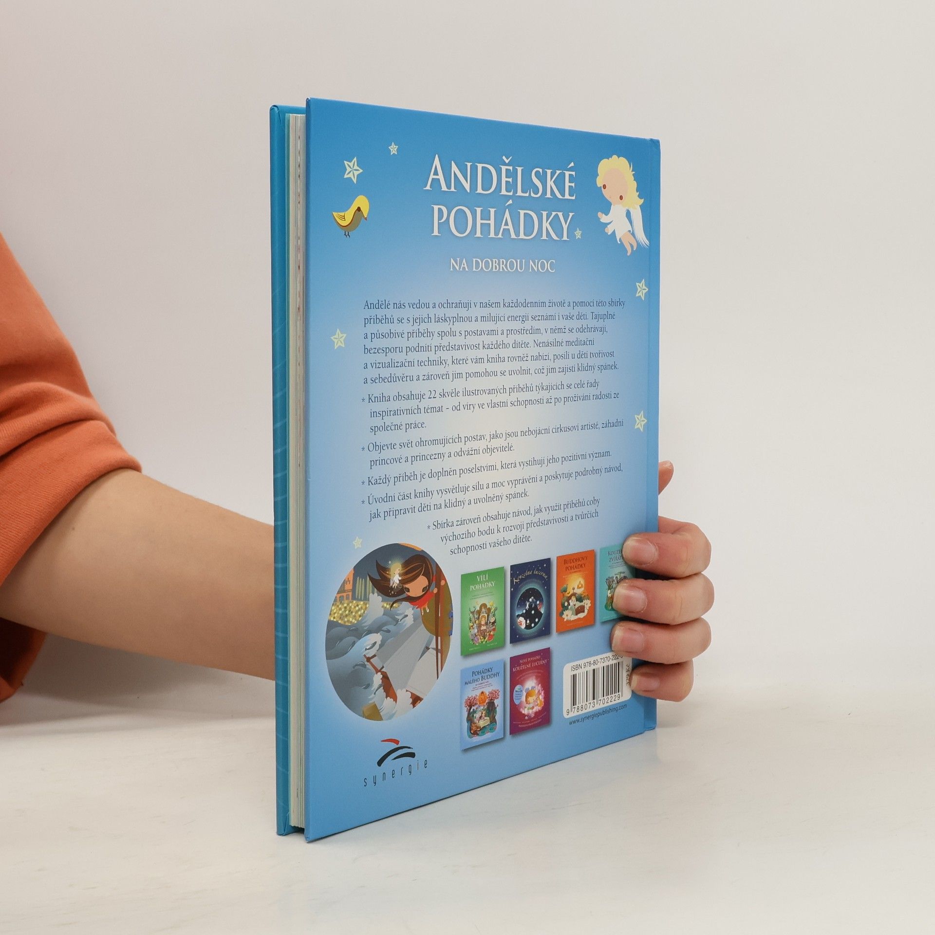 Andělé nás vedou a ochraňují v našem každodenním životě a pomocí této sbírky příběhů se s jejich láskyplnou a milující energií seznámí i vaše děti. Tajuplné a působivé příběhy spolu s postavami a prostředím, v němž se odehrávají, bezesporu podnítí představivost každého dítěte. Nenásilné meditační a vizualizační techniky, které vám kniha rovněž nabízí, posílí u dětí tvořivost a sebedůvěru a zároveň jim pomohou se uvolnit, což jim zajistí klidný spánek. Kniha obsahuje 22 skvěle ilustrovaných příběhů týkajících se celé řady inspirativních témat – od víry ve vlastní schopnosti až po prožívání radosti ze společné práce. Objevte svět pohádkových postav, jako jsou nebojácní cirkusoví artisté, záhadní princové a princezny a odvážní objevitelé. Každý příběh je doplněn poselstvími, která vystihují jeho pozitivní význam. Úvodní část knihy vysvětluje sílu a moc vyprávění a poskytuje podrobný návod, jak připravit děti na klidný a uvolněný spánek. Knížka zároveń obsahuje návod, jak využít příběhu k rozvoji představivosti a tvůrčích schopností vašeho dítěte.