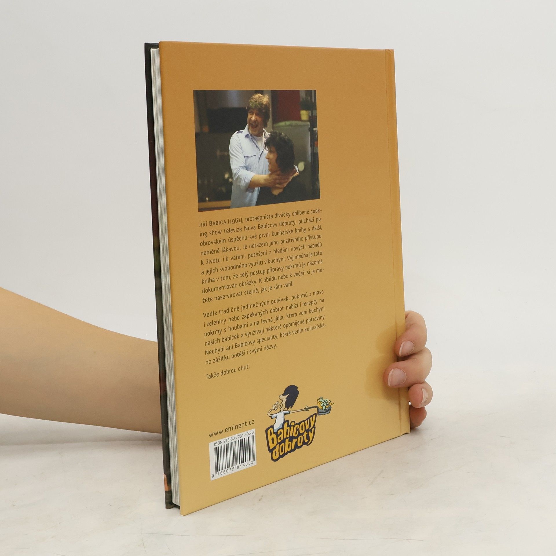 Jiří Babica (1961), protagonista oblíbené cooking show Babicovy dobroty televize Nova, přichází po obrovském úspěchu první se svojí další kuchařskou knihou. Je naplněna jeho pozitivním přístupem k životu i k vaření, potěšením z hledání nových nápadů a jejich svobodným využitím v kuchyni. Výjimečná je v tom, že přináší názorné postupy, které dokumentují celou přípravu jídel. K obědu nebo k večeři si je můžete naservírovat stejně, jak je sám vařil. Vedle tradičně jedinečných polévek, pokrmů z masa i zeleniny nebo zapékaných dobrot nabízí i recepty na pokrmy s houbami a levná jídla, která voní kuchyní našich babiček a využívají některé opomíjené potraviny. Nechybí ani Babicovy speciality, které vedle kulinářského zážitku potěší i svými názvy. Takže dobrou chuť.