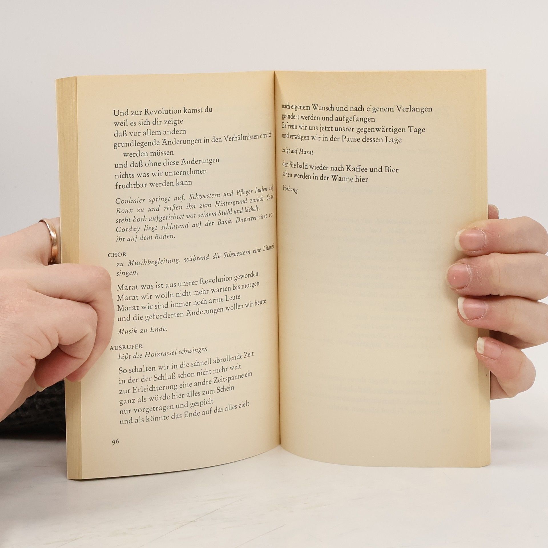 Sein neues Theaterstück, das sich eng an historische Fakten hält, auf authentisches Material sich gründet und doch von einem historischen Stück so weit wie nur irgend möglich entfernt ist. Leben und Tod Jean Paul Marats werden als Spiel im Spiel, als Theater im Theater, dreizehn Jahre nach seinem Tode im Irrenhaus von Charenton dargestellt. Regie führt der Marquis de Sade.