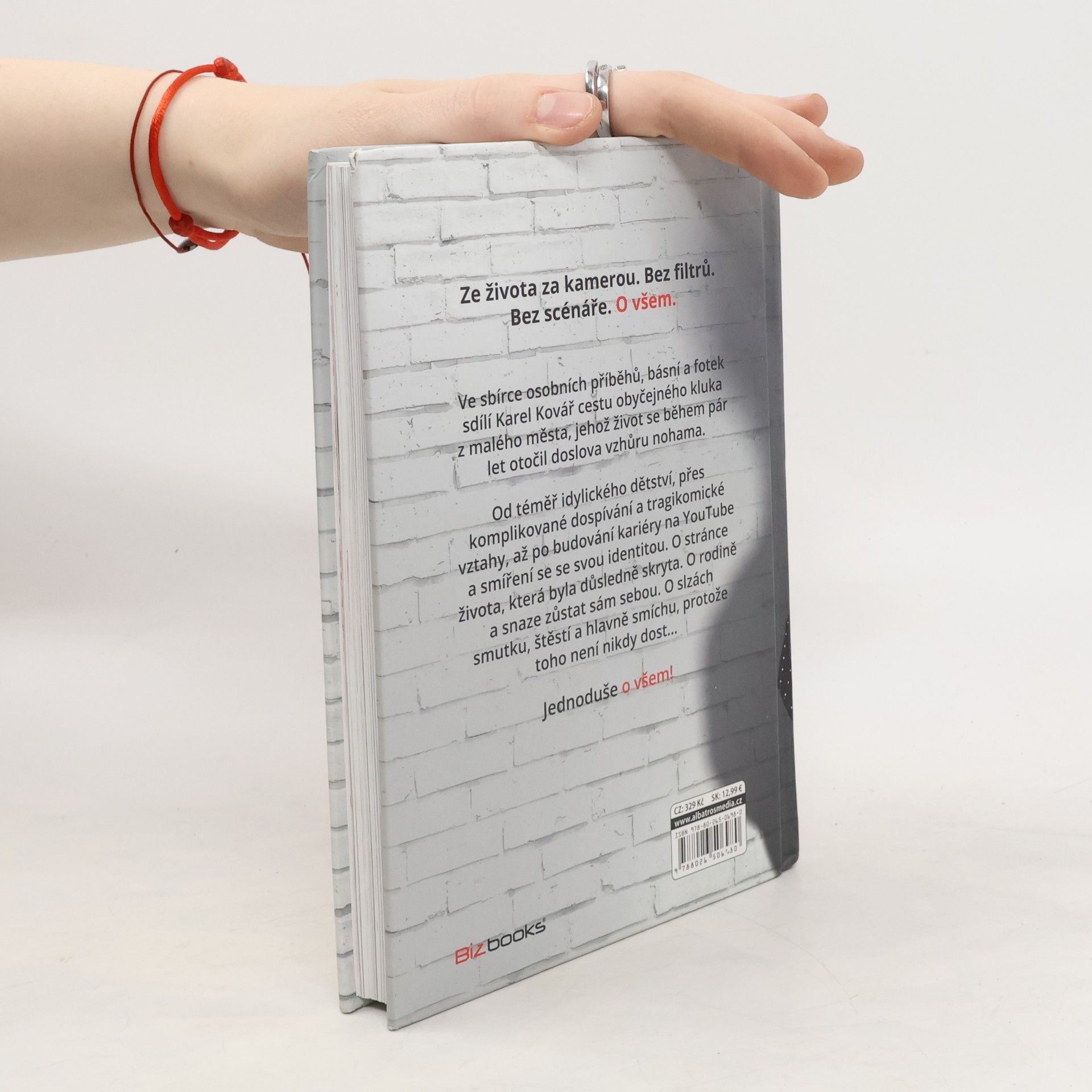 Bez filtrů. Bez scénáře. O všem. Ve sbírce osobních příběhů, básní a fotek sdílí Karel Kovář cestu obyčejného kluka z malého města, jehož život se během pár let otočil doslova vzhůru nohama. Od téměř idylického dětství, přes komplikované dospívání a tragikomické vztahy, až po budování kariéry na YouTube a smíření se se svou identitou. O stránce života, která byla důsledně skryta. O rodině a snaze zůstat sám sebou. O slzách smutku, štěstí a hlavně smíchu, protože toho není nikdy dost–… Jednoduše o všem!