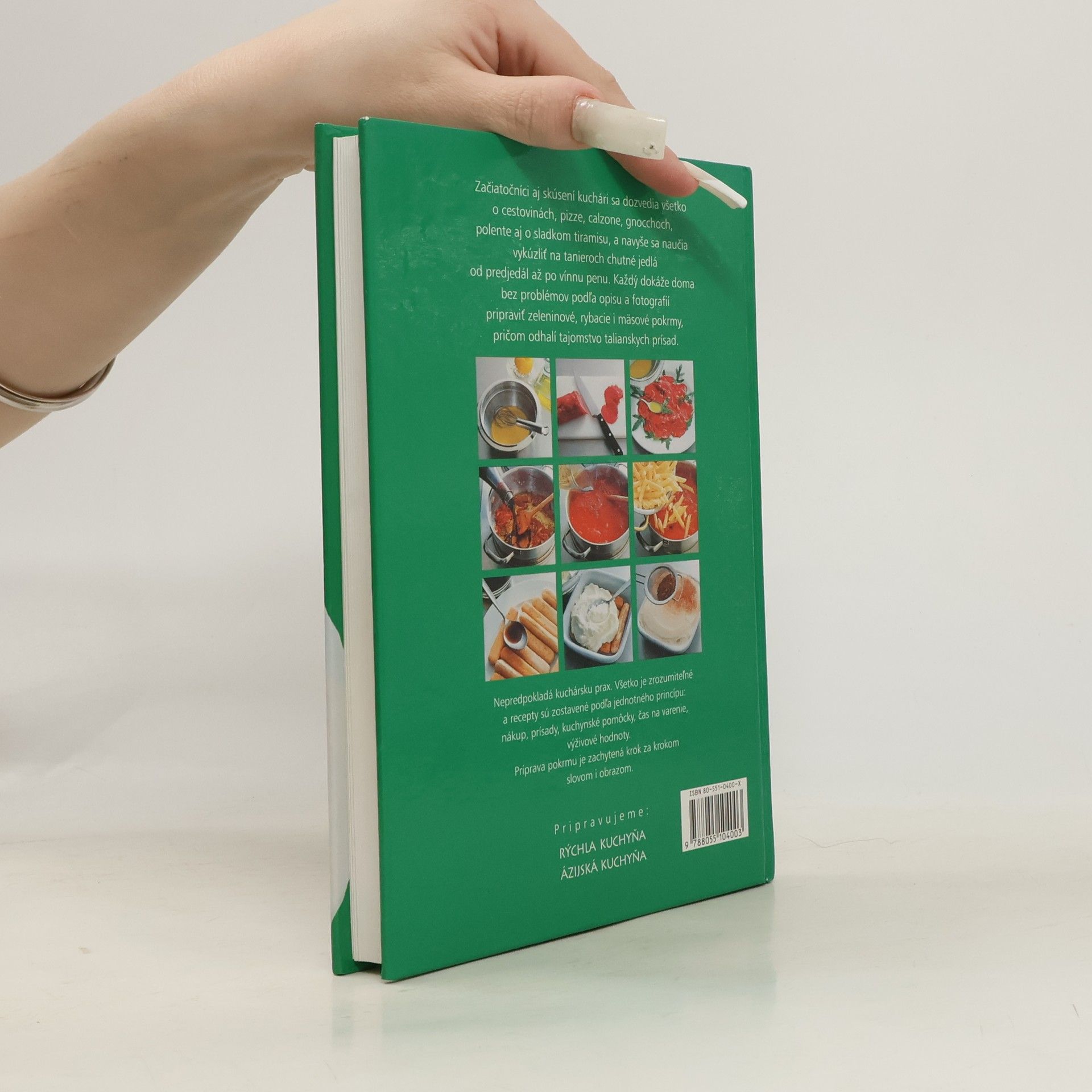Začiatočníci aj skúsení kuchári sa dozvedia všetko o cestovinách, pizze, calzone, gnocchoch, polente aj o sladkom tiramisu, a navyše sa naučia vykúzliť na tanieroch chutné jedlá od predjedál až po vínnu penu. Každý dokáže doma bez problémov podľa opisu a fotografií pripraviť zeleninové, rybacie i mäsové pokrmy, pričom odhalí tajomstvo talianskych prísad. Malá škola varenia - nepredpokladá kuchársku prax. Všetko je zrozumiteľné a recepty sú zostavené podľa jednotného princípu: nákup, prísady, kuchynské pomôcky, čas na varenie, výživové hodnoty. Príprava pokrmu je zachytená krok za krokom slovom i obrazom