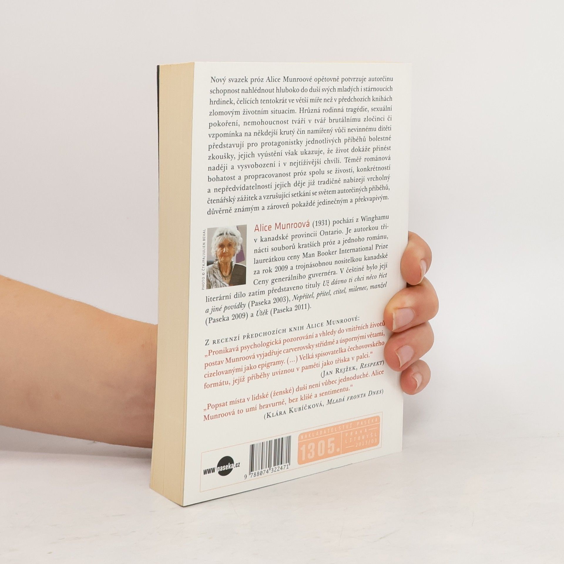Zatím poslední svazek próz Alice Munroové opětovně potvrzuje autorčinu schopnost nahlédnout hluboko do duší svých mladých i stárnoucích hrdinek, čelících tentokrát ve větší míře než v předchozích knihách zlomovým životním situacím. Hrůzná rodinná tragédie, sexuální pokoření, nemohoucnost tváří v tvář brutálnímu zločinci či vzpomínka na někdejší krutý čin namířený vůči nevinnému dítěti představují pro protagonistky jednotlivých příběhů bolestné zkoušky, jejich vyústění však ukazuje, že život dokáže přinést naději a vysvobození i v nejtíživější chvíli. Téměř románová bohatost a propracovanost próz spolu se živostí, konkrétností a nepředvídatelností jejich děje nabízejí již tradičně vrcholný čtenářský zážitek a nové vzrušující setkání se světem autorčiných příběhů, důvěrně známým a zároveň pokaždé jedinečným a překvapivým.