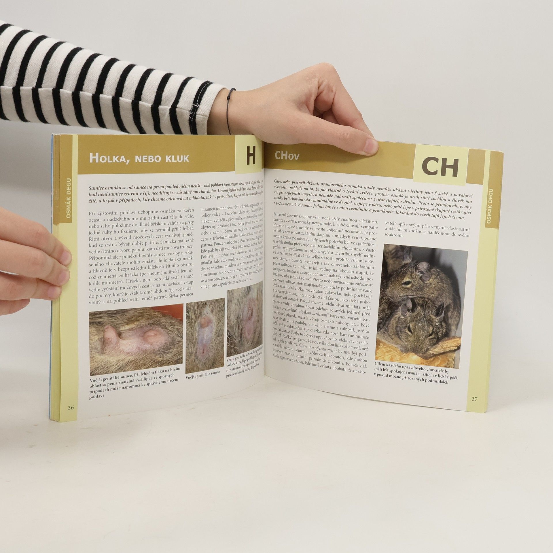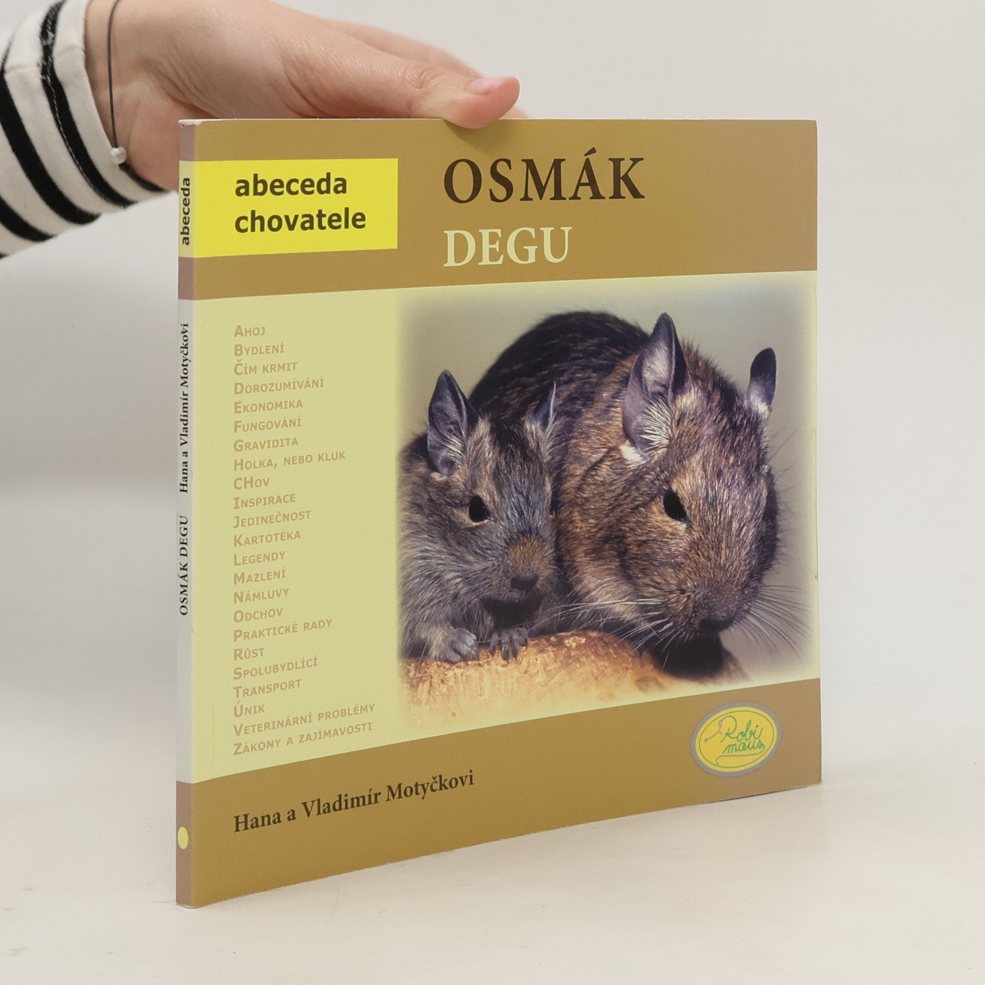 Osmák degu je nová kniha z edice Abeceda chovatele, v níž naleznete veškeré potřebné informace pro chov tohoto malého hlodavce. Kniha obsahuje abecedně řazené kapitoly s názvem Čím krmit, Dorozumívání, Chov, Mazlení, Transport, Veterinární problémy a mnoho dalších zajímavostí. Vše je bohatě doplněno barevnými fotografiemi. -- www.bux.cz --