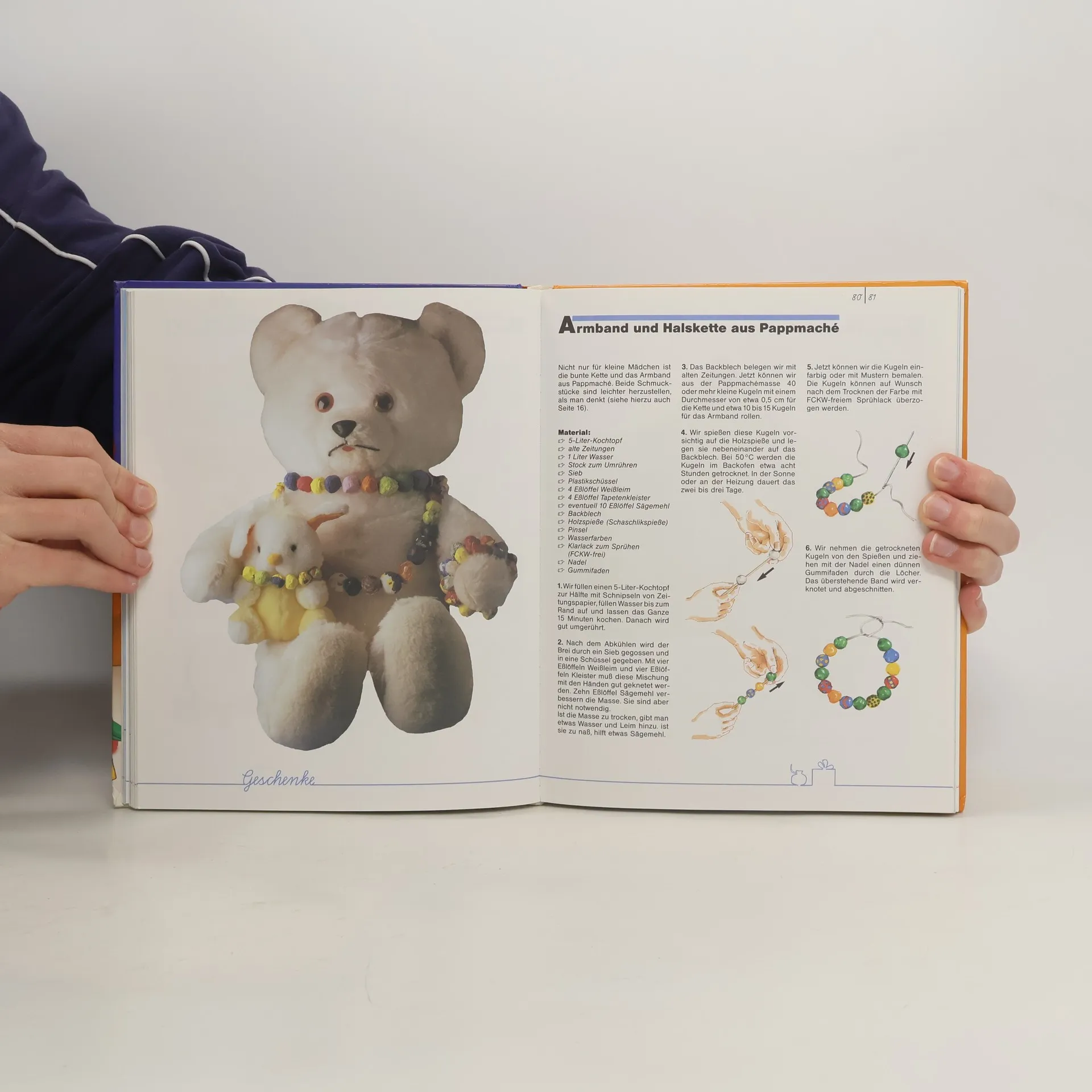 Zeigt eine Vielzahl von einfachen Bastelarbeiten (z.B. Karten, Dekorationen, Geschenke, Maskeraden, Spielsachen, Basteleien für Ostern und Weihnachten) aus Papier, Karton, Ton, Haushalts- und Naturmaterialien.