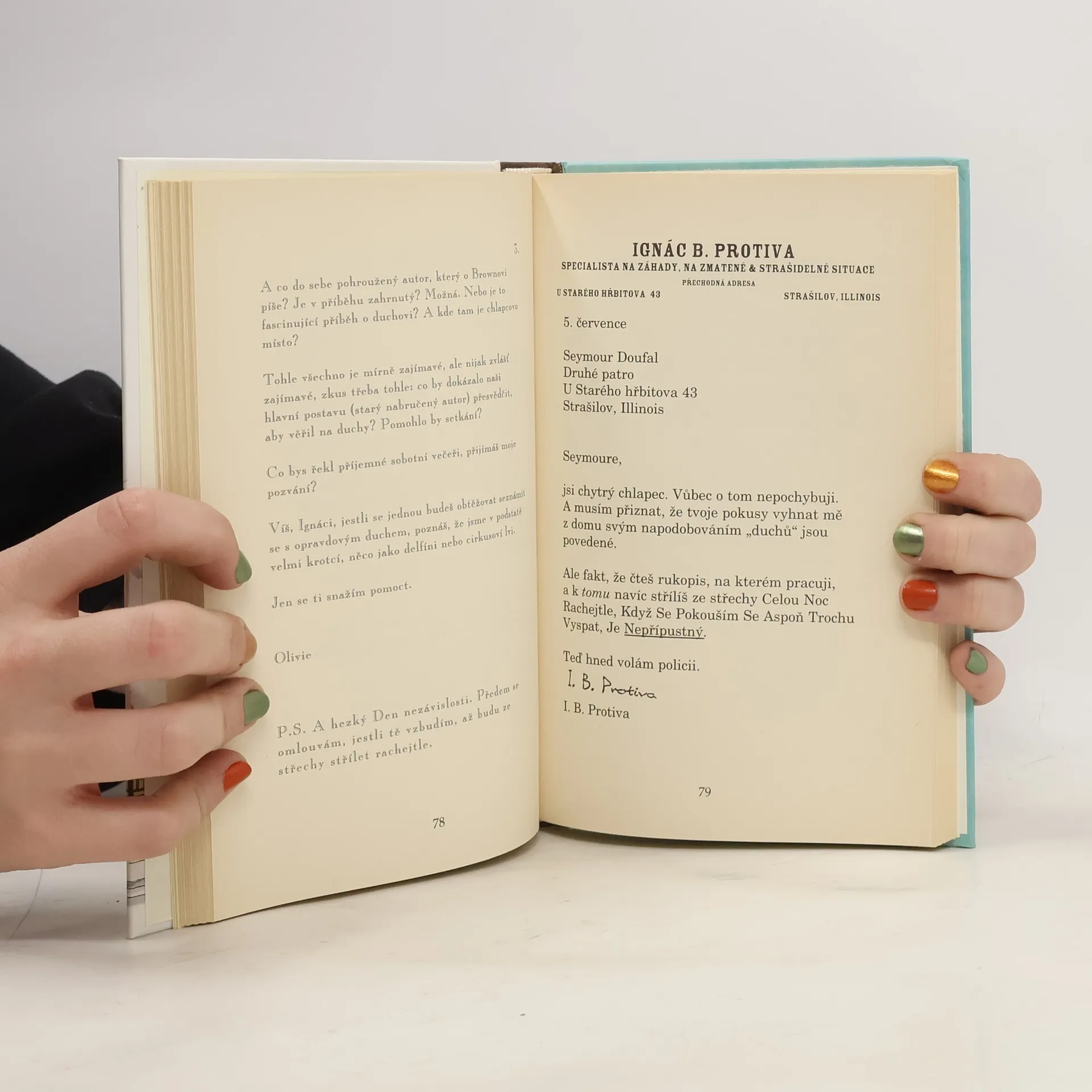 Ignác B. Protiva, úspěšný autor seriálu Krotitel duchů, se přestěhuje do starého viktoriánského domu v ulici Hřbitovní 43. Doufá, že nalezne klidné místo k psaní. Ale realitní agentka mu zamlčí, že dům už obyvatele má! Je jím jedenáctiletý Seymour, pak kočka a nedůtklivý duch, kdysi neúspěšná spisovatelka Olivie. Za života nevydala jediný strašidelný příběh, a proto teď po smrti straší… O tom, že spolu bydlí v jednom domě, zatím nic netuší…