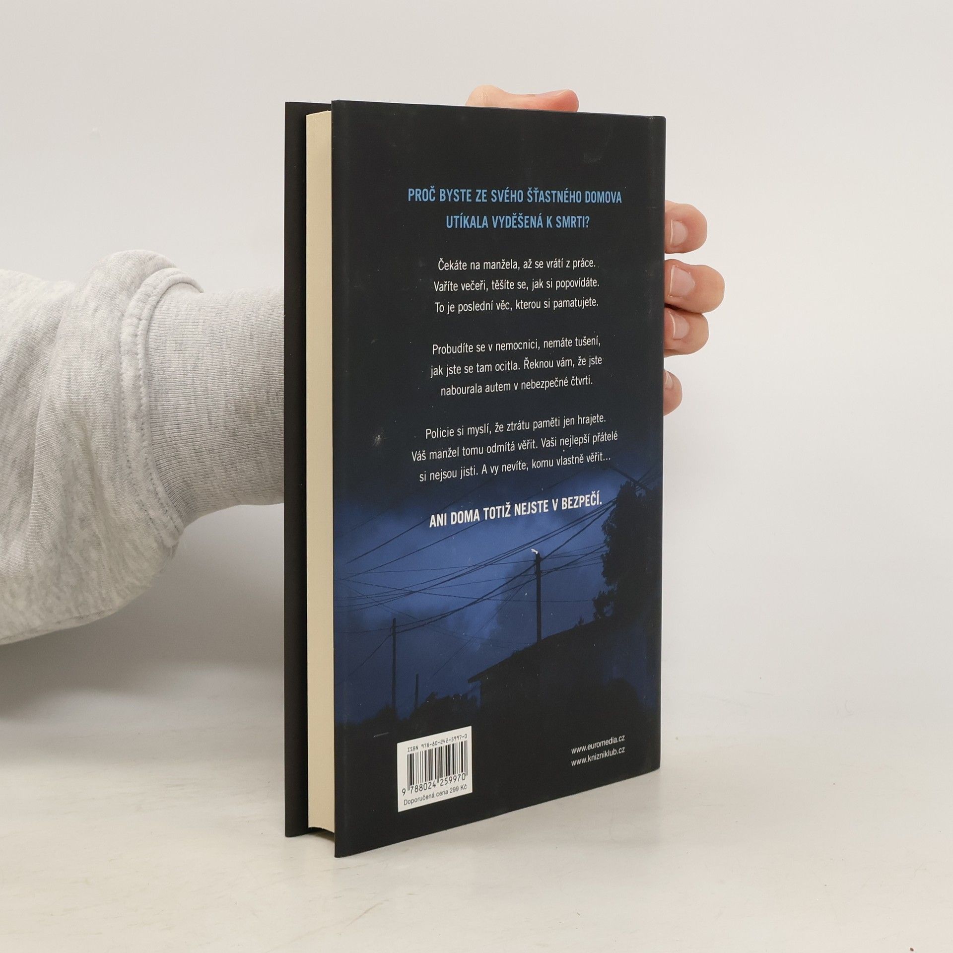 V téhle útulné čtvrti spokojených domovů zůstávají nebezpečné lži uzavřeny za dveřmi… Shari Lapena, autorka thrilleru roku 2017 Manželé odvedle, přichází s dalším rodinným dramatem plným tajemství a nečekaných zvratů, které nikdy nepřestanou překvapovat. Karen a Tom Kruppovi jsou šťastní – vzali se teprve nedávno a vlastní nádherný dům poblíž New Yorku. Jednoho dne se Tom vrátí domů a zjistí, že Karen zmizela – její auto je pryč a zdá se, že odjela ve spěchu. Nevzala si dokonce ani kabelku, telefon, doklady. Krátce nato se Tom dozví, že Karen měla nehodu a leží v nemocnici s otřesem mozku a ztrátou paměti. Po čase se Karen, odhodlaná vyléčit se a zapomenout, vrací s Tomem domů. Ale zdá se, že se tam něco změnilo. Něco není v pořádku. Někdo tam byl. Někdo cizí. Jenže v tomhle domě je každý cizí. Každý má něco, co by podle něj mělo zůstat skryto. Něco, kvůli čemu by raději vraždil, jen aby si to mohl nechat pro sebe...