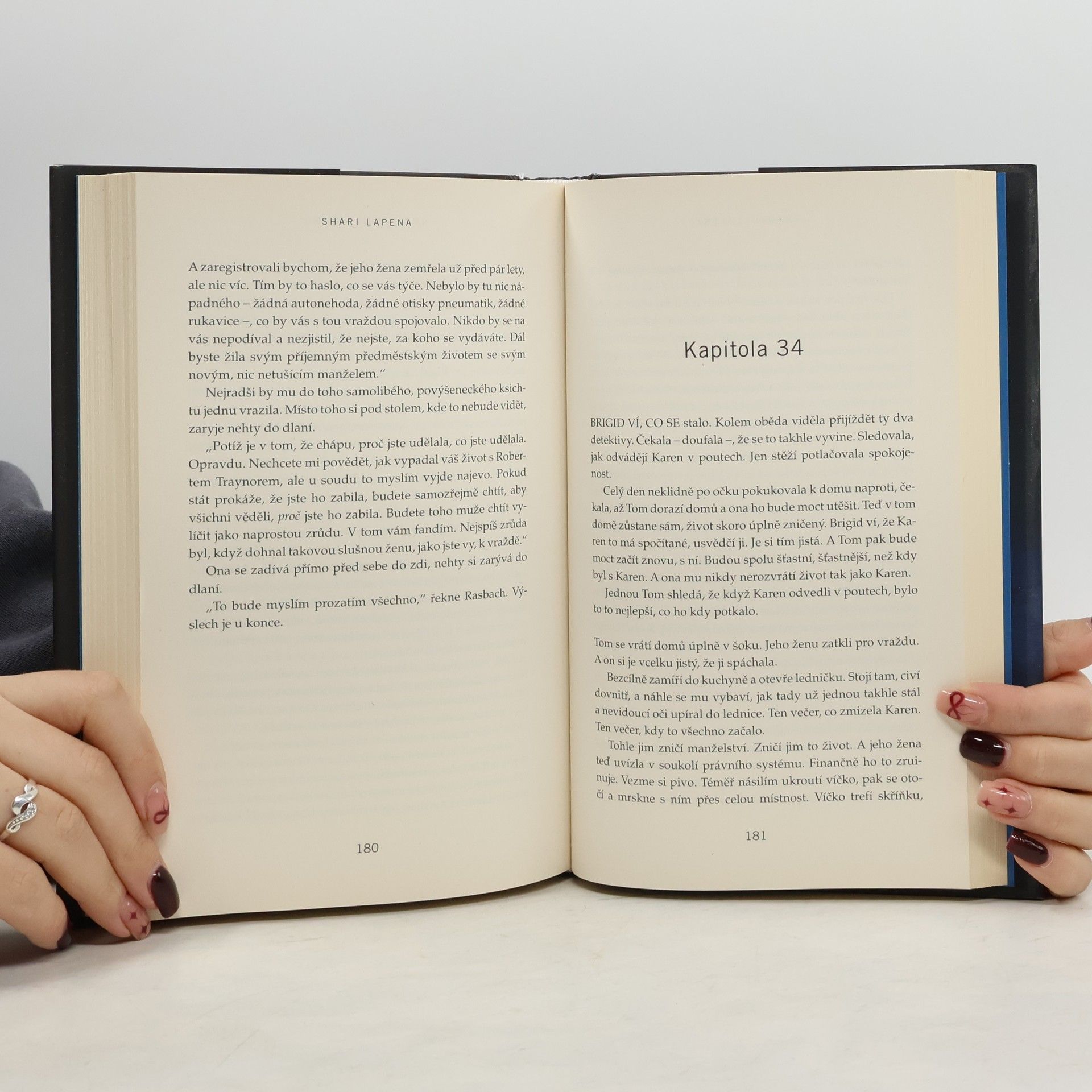 V téhle útulné čtvrti spokojených domovů zůstávají nebezpečné lži uzavřeny za dveřmi… Shari Lapena, autorka thrilleru roku 2017 Manželé odvedle, přichází s dalším rodinným dramatem plným tajemství a nečekaných zvratů, které nikdy nepřestanou překvapovat. Karen a Tom Kruppovi jsou šťastní – vzali se teprve nedávno a vlastní nádherný dům poblíž New Yorku. Jednoho dne se Tom vrátí domů a zjistí, že Karen zmizela – její auto je pryč a zdá se, že odjela ve spěchu. Nevzala si dokonce ani kabelku, telefon, doklady. Krátce nato se Tom dozví, že Karen měla nehodu a leží v nemocnici s otřesem mozku a ztrátou paměti. Po čase se Karen, odhodlaná vyléčit se a zapomenout, vrací s Tomem domů. Ale zdá se, že se tam něco změnilo. Něco není v pořádku. Někdo tam byl. Někdo cizí. Jenže v tomhle domě je každý cizí. Každý má něco, co by podle něj mělo zůstat skryto. Něco, kvůli čemu by raději vraždil, jen aby si to mohl nechat pro sebe...