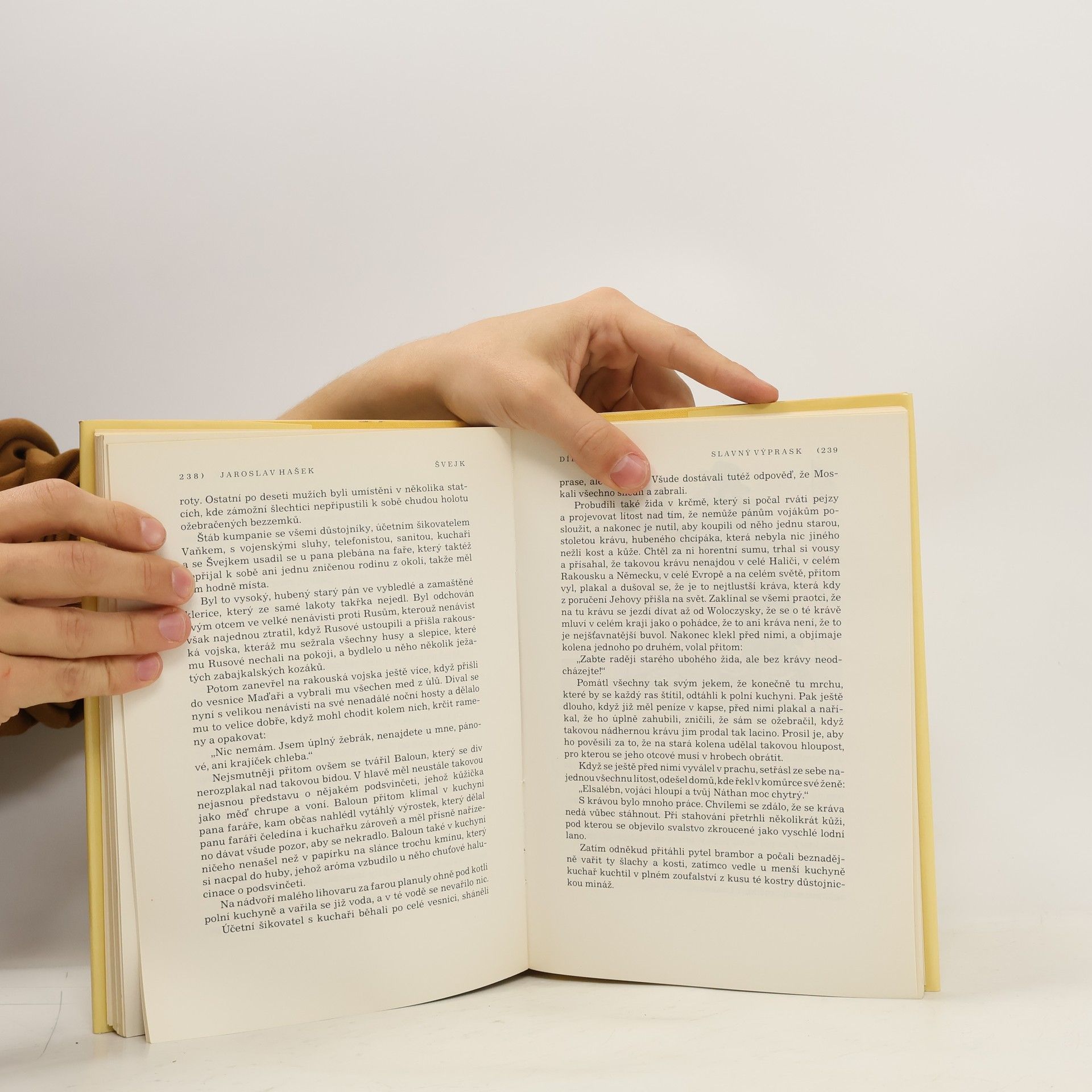 Slavný výprask - 91. pěší pluk je opět naložen do vlaku, který jej veze jako „novou skupinu lidí hnaných na jatky“ do Haliče na ruskou frontu. Hašek tuto pouť přes celé Uhry popisuje tak, že se román stává skutečnou obžalobou války a stupidních důstojníků, kterým nejde o nic jiného než o vlastní prospěch bez ohledu na osudy vojáků, kterým mají velet. Jejich schopnosti Hašek popisuje takto: „Byl to pán velkých vojenských schopností, které se mu vrazily do nohou ve formě podágry“. Názory prostých vojáků na válku charakterizuje Hašek slovy: „Po celou dobu železniční přepravy bataliónu, který měl sklízet válečnou slávu, až projde pěšky od Laborce východní Haličí na front, vedly se ve vagónu, kde byl jednoroční dobrovolník a Švejk, opět podivné řeči, víceméně velezrádného obsahu“. Na konci dílu je Švejk vyslán jako kvartýrmachr zajistit pro svou kumpanii nocleh ve Felštýně. Když Švejk dojde k malému rybníku, setká se tam s uprchlým ruským zajatcem, který se tam koupal a po spatření Švejka se dal nahý na útěk. Švejk si oblékne jeho uniformu, protože je zvědav, jak by mu asi slušela. V této uniformě ho najde patrola polního četnictva, která tohoto ruského uprchlíka hledala. Jsou to Maďaři, kteří Švejkovi nerozumí a přes jeho protesty ho zařadí do transportu ruských zajatců určených pracovat na opravě železniční trati. Tak Švejk upadne omylem do rakouského zajetí. Pokračování slavného výprasku - Poté, co je zjištěno, že Švejk je Čech, je na něj pohlíženo jako na zběha a polní soud ho odsoudí k smrti. Duchovní útěchu před popravou mu má poskytnout polní kurát Martinec, původně skutečně nábožensky založený muž, který stykem s opilými důstojníky postupně mravně upadá, což si nepřestává v skrytu duše neustále vyčítat. Švejk jej však považuje za dalšího vězně a svými proslovy jej tak vyděsí, že Martinec z cely prchne na důstojnický večírek, kde se zpije do bezvědomí „s přesvědčením, že se hraje o jeho duši a on sám že je mučedníkem“. Nakonec se vše vysvětlí a Švejk se opět ocitne u své marškumpanie. Haškův text pak končí proslovem poručíka Duba „S okresním hejtmanem jsme vždy říkávali: Patriotismus, věrnost k povinnosti, sebepřekonání, to jsou ty pravé zbraně ve válce! Připomínám si to zejména dnes, když naše vojska v dohledné době překročí hranice“. Vše, co případně v knize následuje za touto větou, je pokračování dopsané od Karla Vaňka.