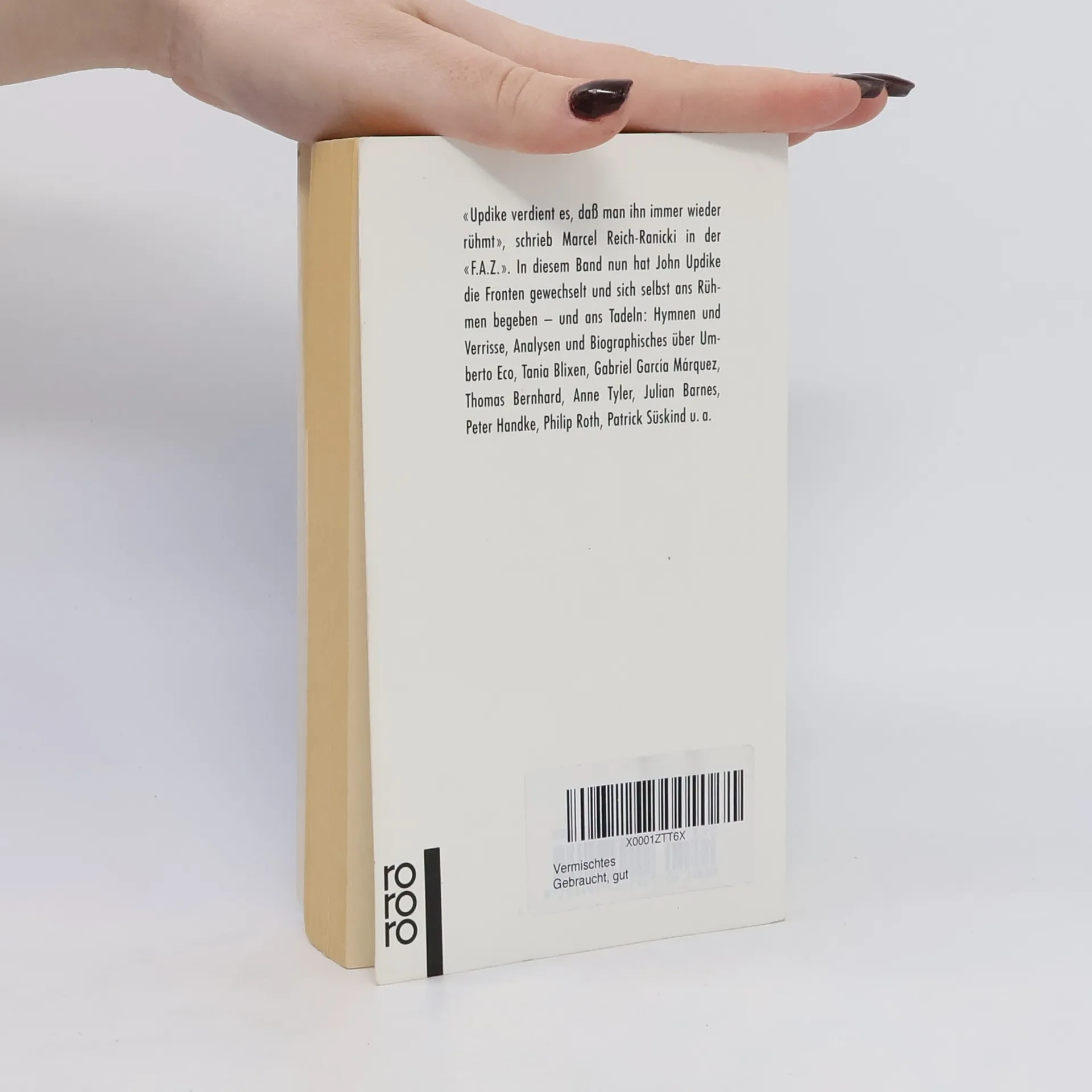 In diesem Band hat John Updike die Fronten gewechselt und sich selbst ans Rühmen begeben - und ans Tadeln: Hymnen und Verrisse, Analysen und Biographisches über Umberto Eco, Tania Blixen, Gabriel Garcia Marquez, Thomas Bernhard, Anne Tyler, Julian Barnes, Peter Handke, Philip Roth, Patrick Süskind u. a.