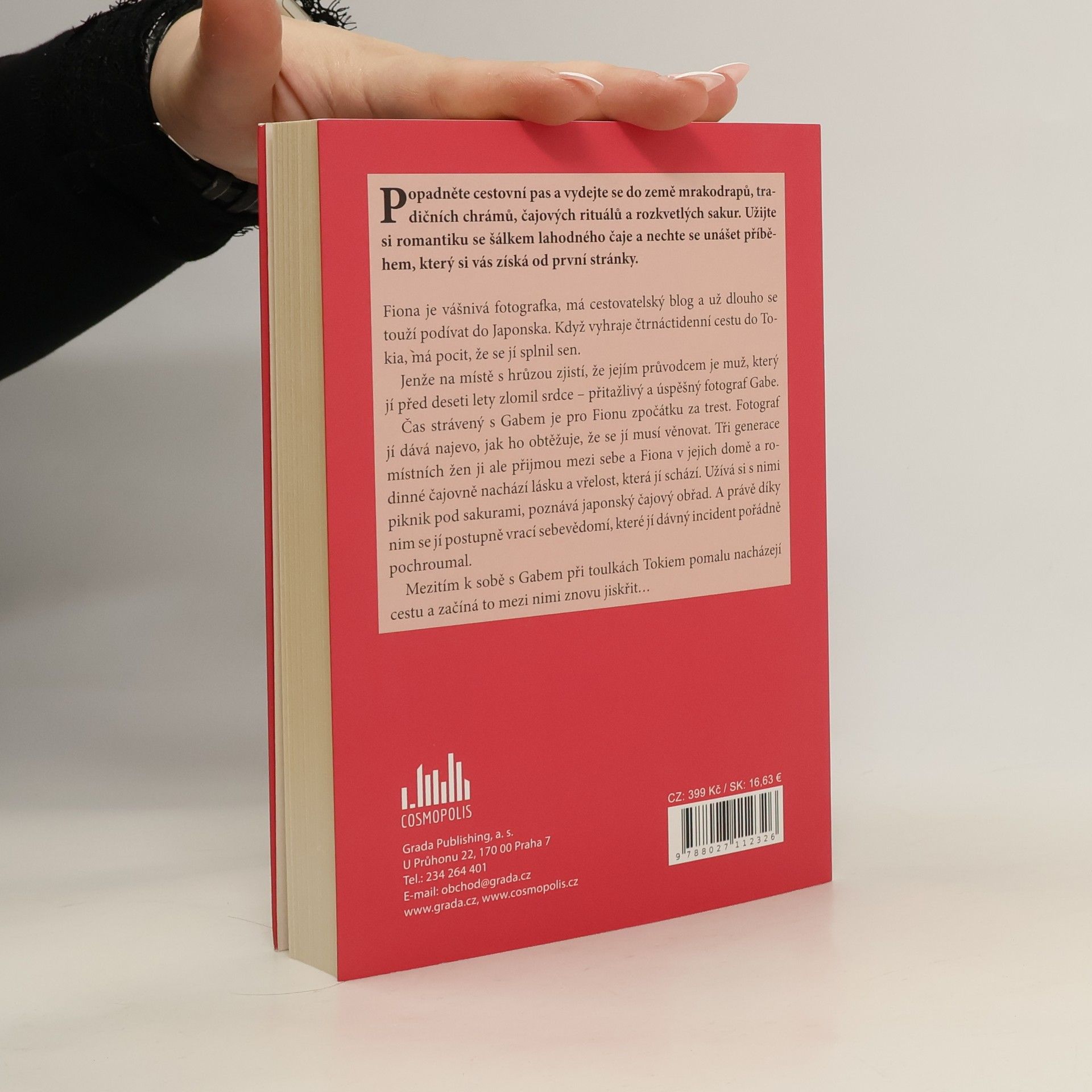 Popadněte cestovní pas a vydejte se do země mrakodrapů, tradičních chrámů, čajových rituálů a rozkvetlých sakur. Užijte si romantiku s šálkem lahodného čaje a nechte se unášet příběhem, který si vás získá od první stránky. Fiona je vášnivá fotografka, má cestovatelský blog a už dlouho se touží podívat do Japonska. Když vyhraje čtrnáctidenní cestu do Tokia, má pocit, že se jí splnil sen. Jenže na místě s hrůzou zjistí, že jejím průvodcem je muž, který jí před deseti lety zlomil srdce – přitažlivý a úspěšný fotograf Gabe. Čas strávený s Gabem je pro Fionu zpočátku za trest. Fotograf jí dává najevo, jak ho obtěžuje, že se jí musí věnovat. Tři generace místních žen ji ale přijmou mezi sebe a Fiona v jejich domě a rodinné čajovně nachází lásku a vřelost, která jí schází. Užívá si s nimi piknik pod sakurami, poznává pravý japonský čajový obřad. A právě díky nim se jí postupně vrací sebevědomí, které jí dávný incident pořádně pochroumal. Mezitím k sobě s Gabem při toulkách Tokiem pomalu nacházejí cestu a začíná to mezi nimi znovu jiskřit…