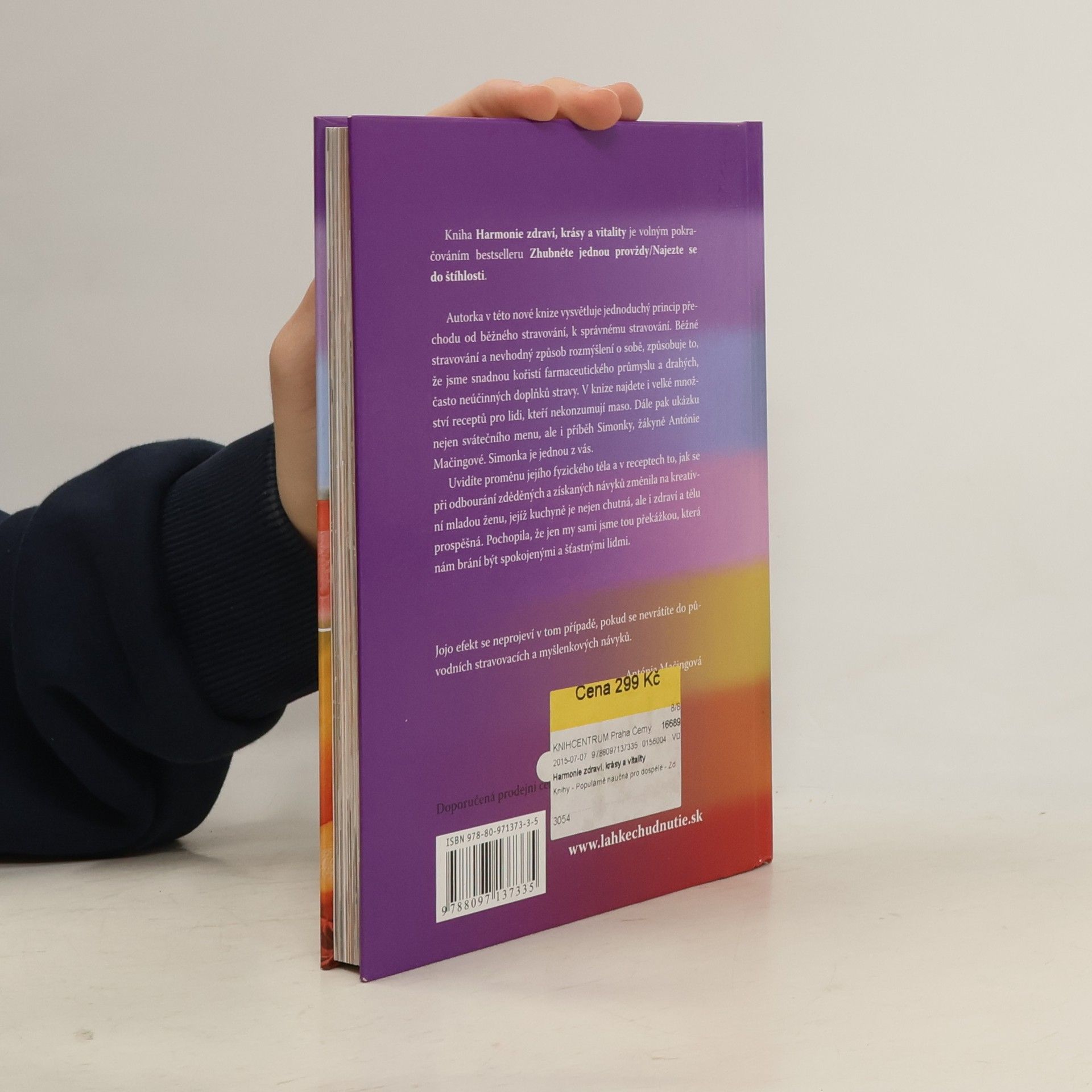 Autorka v této nové knize vysvětluje jednoduchý princip přechodu od běžného stravování, k správnému stravování. Běžné stravování a nevhodný způsob rozmýšlení o sobě, způsobuje to, že jsme snadnou kořistí farmaceutického průmyslu a drahých, často neúčinných doplňků stravy. V knize najdete i velké množství receptů pro lidi, kteří nekonzumují maso. Dále pak ukázku nejen Vánočního menu, ale i příběh Simonky, žákyně Antónie Mačingové. Simonka je jednou z vás. Uvidíte proměnu jejího fyzického těla a v receptech to, jak se při odbourání zděděných a získaných návyků změnila na kreativní mladou ženu, jejíž kuchyně je nejen chutná, ale i zdraví a tělu prospěšná. Pochopila, že jen my sami jsme tou překážkou, která nám brání být spokojenými a šťastnými lidmi. Jojo efekt se neprojeví v tom případě, pokud se nevrátíte do původních stravovacích návyků. Antónia Mačingová
