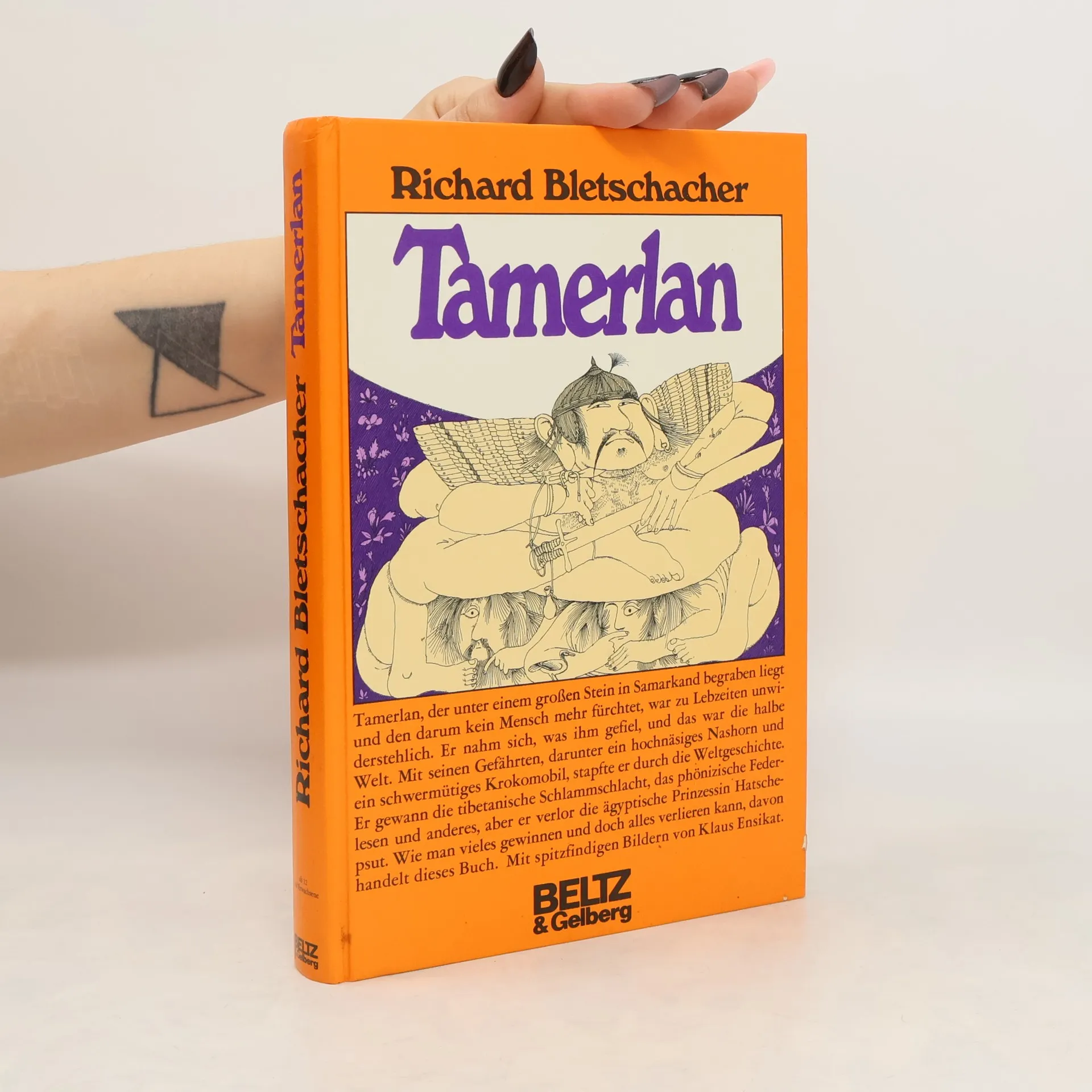 Tamerlan, oder Timur-Lenk, geboren in 1336 und begraben unter einem großen Stein in Samarkand und den darum kein Mensch mehr fürchtet, war zu Lebzeiten unwiderstehlich. Er nahm sich, was ihm gefiel, und das war die halbe Welt. Mit seinen Gefährten, darunter ein hochnäsiges Nashorn und ein schwermütiges Krokomobil, stapfte er durch die Weltgeschichte. Er gewann die tibetanische Schlammschlacht, das phönizische Federlesen und anderes, aber er verlor die ägyptische Prinzessin Hatschepsut.